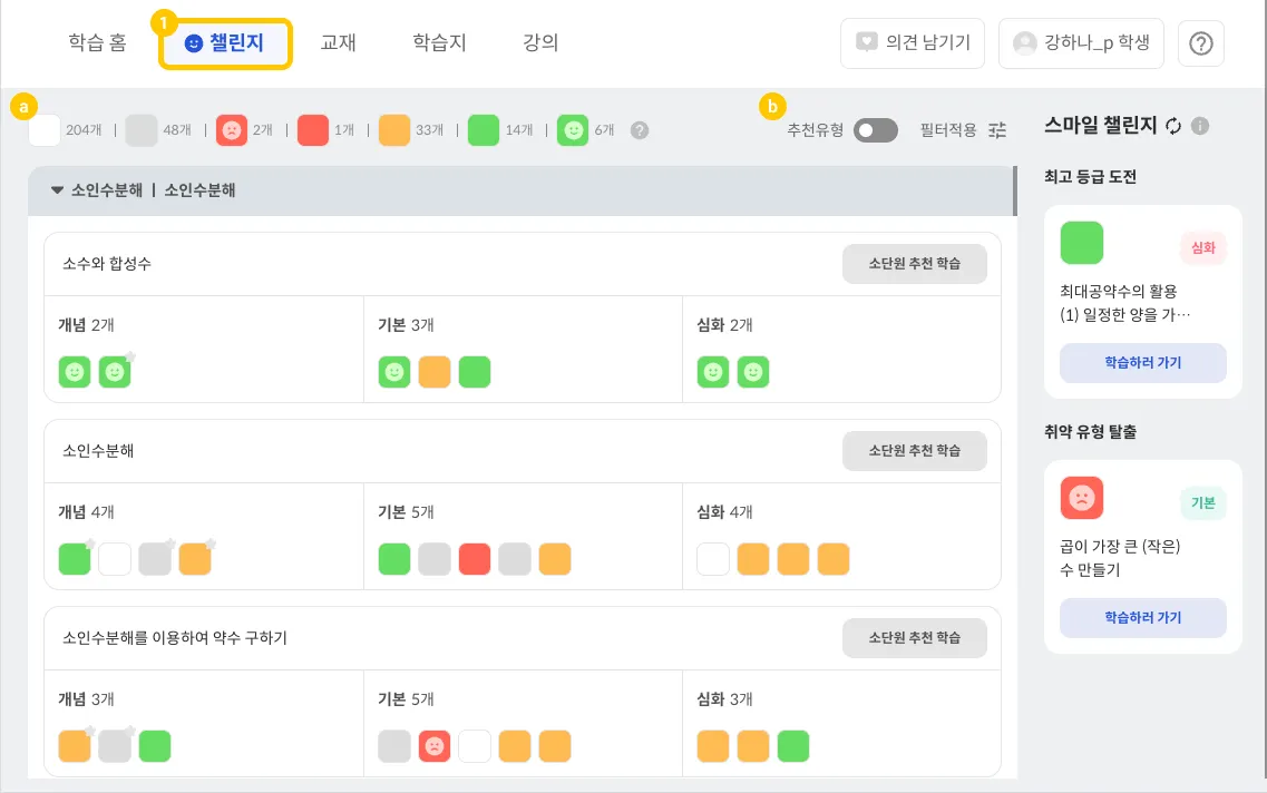 학년 학기에서 학습할 유형의 성취도 난이도를 상단에서 확인할 수 있습니다.
