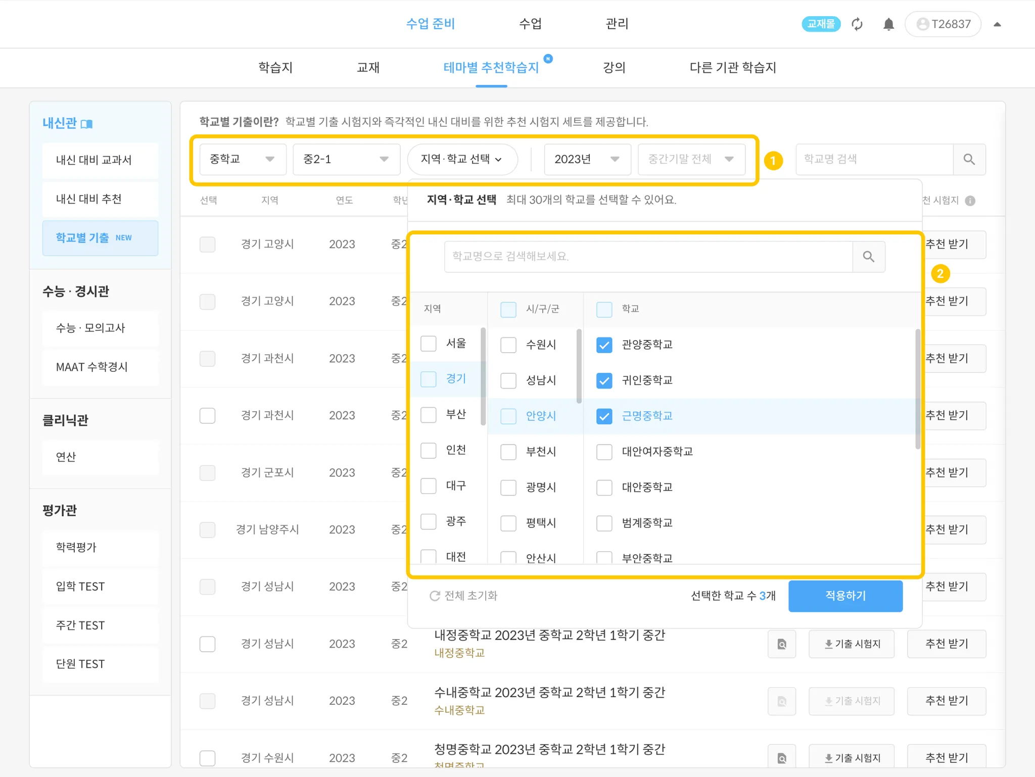 수업 준비 > 테마별 추천학습지 > 학교별 기출