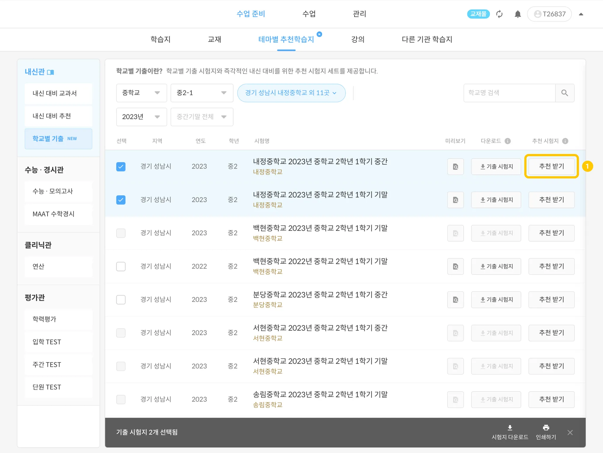 같은 학교 시험지 : 선택한 학교의 유사 추천 시험지