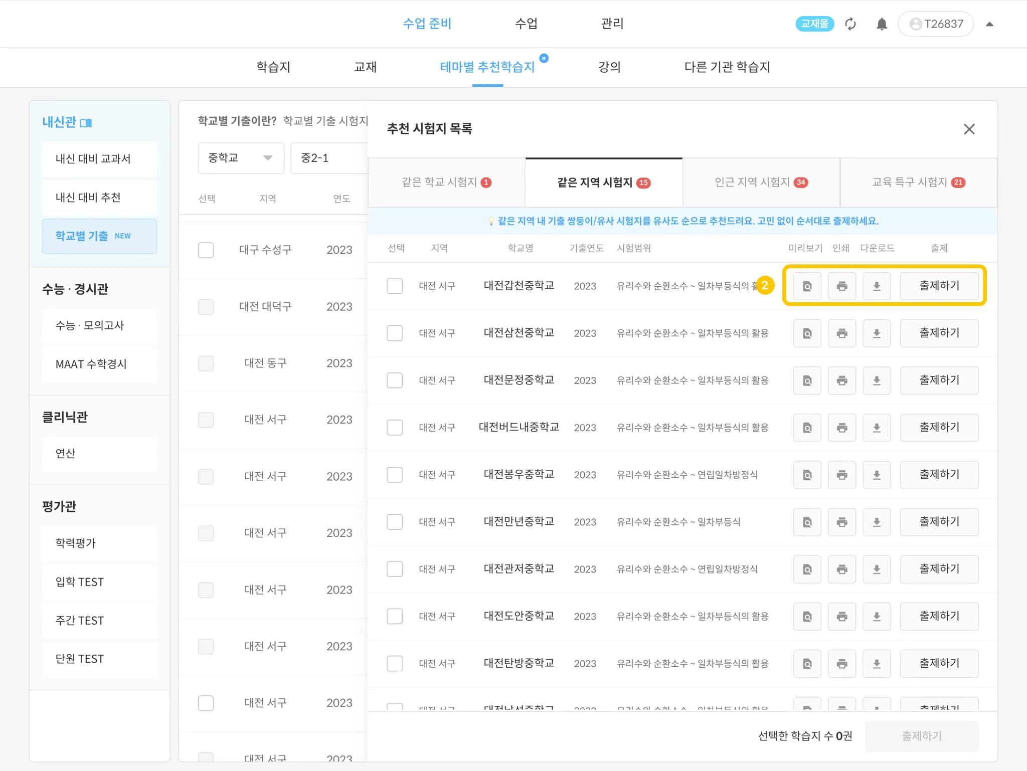 같은 지역 시험지 : 선택한 학교와 동일한 지역의 유사 추천 시험지