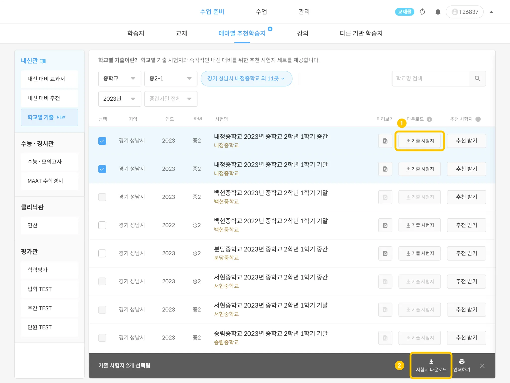 [수업 준비] - [테마별 추천학습지] - [학교별 기출]로 이동합니다.