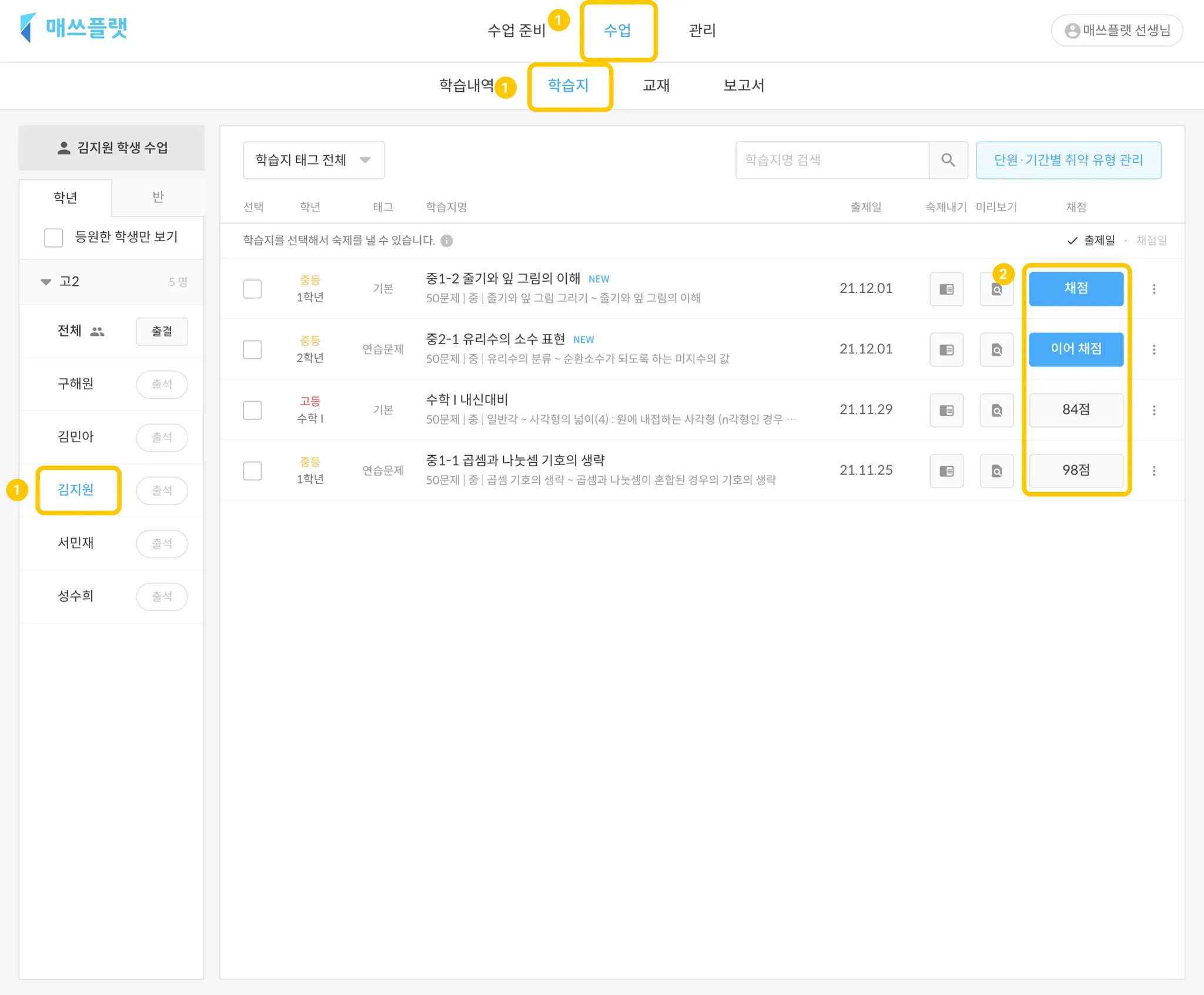 [수업] - 학생 이름 버튼을 누른 뒤, [학습지]에 들어갑니다.