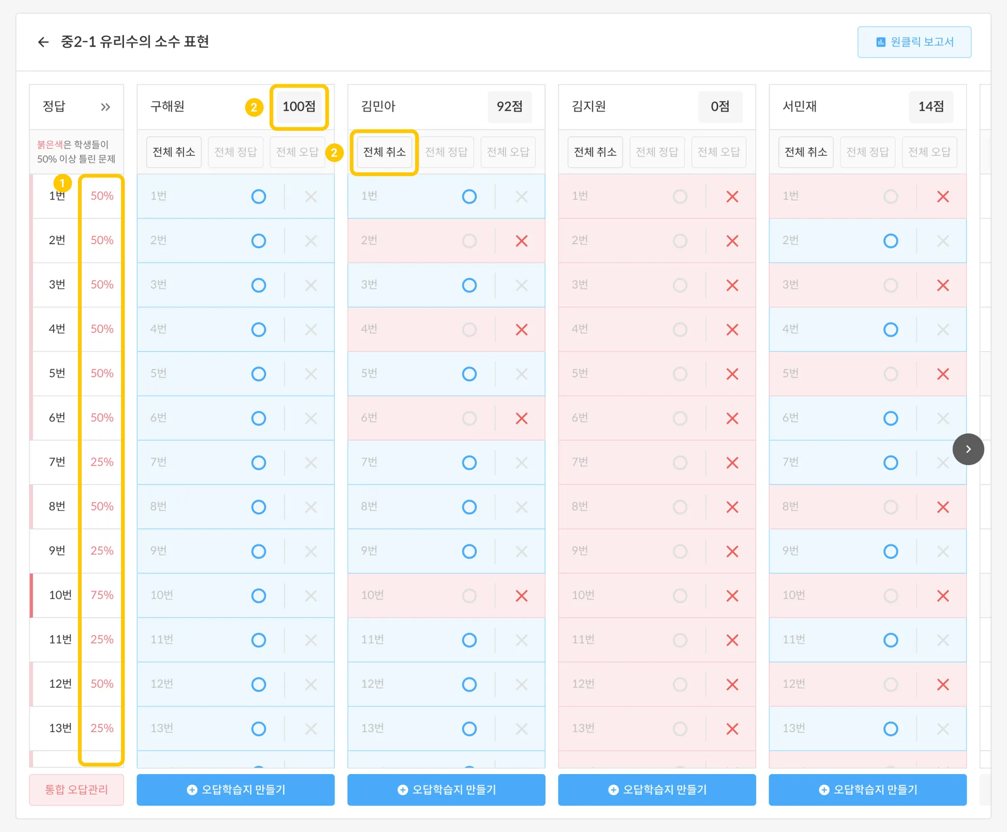 많이 틀린 학생은 전체 오답을 누른 후 맞은 문제만 체크하여 빠르게 채점할 수 있습니다.