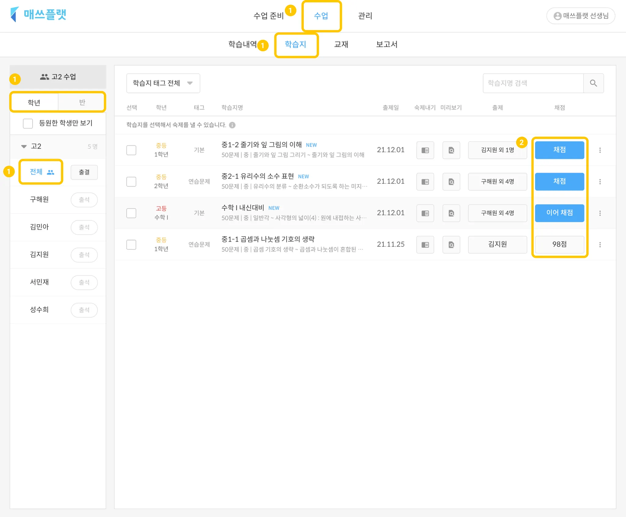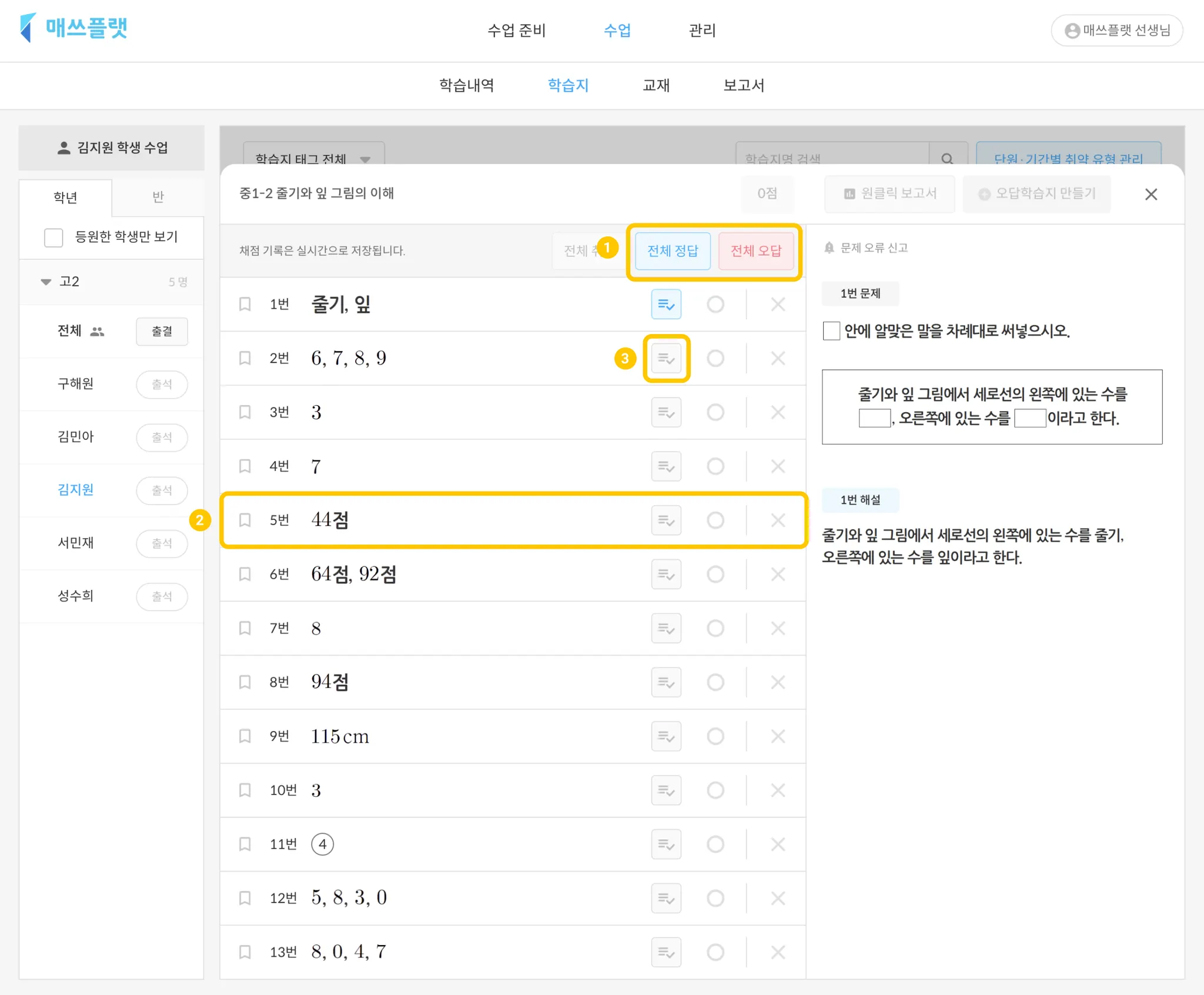 수업 > 학년, 반 또는 학생 선택 > 학습지