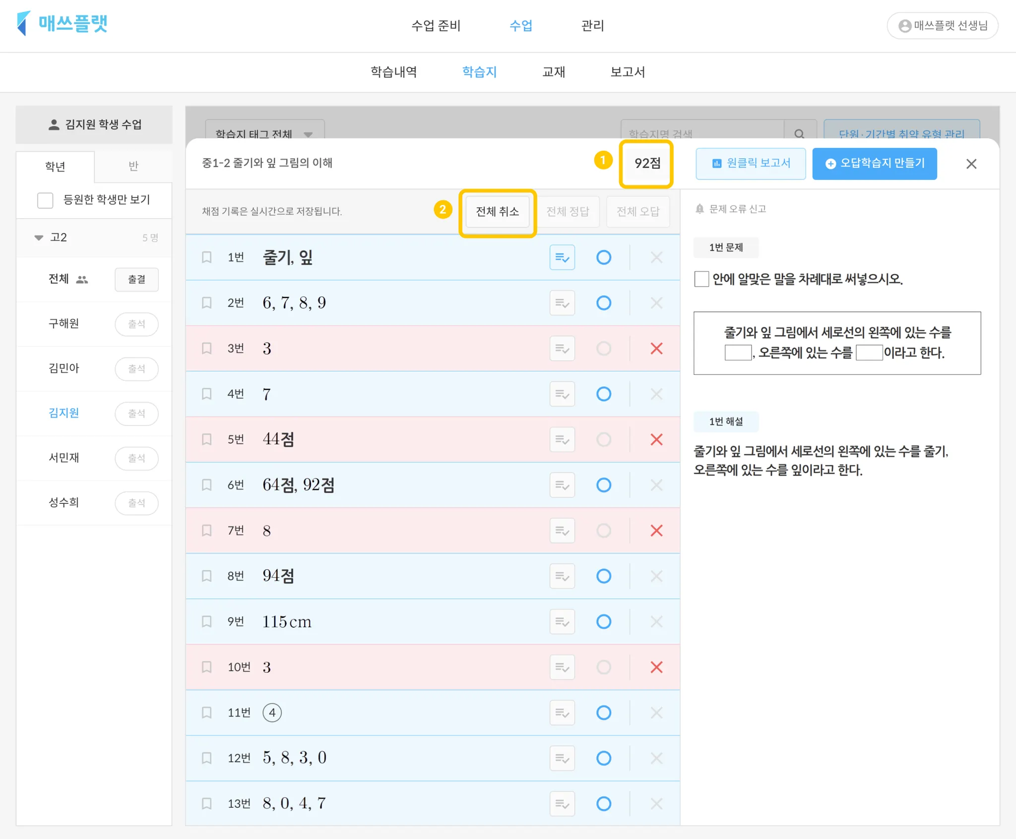 많이 틀린 학생들은 전체 오답을 누른 후 맞은 문제만 체크하여 빠르게 채점할 수 있습니다.