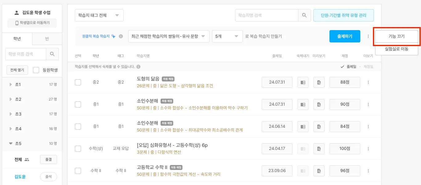 원클릭 복습 학습지 우측의 점 3개를 눌러서, 기능을 끌 수 있습니다.