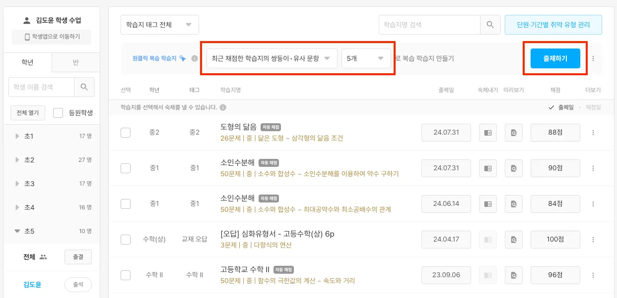 해당 학생에게 바로 복습 학습지가 생성 및 출제됩니다.