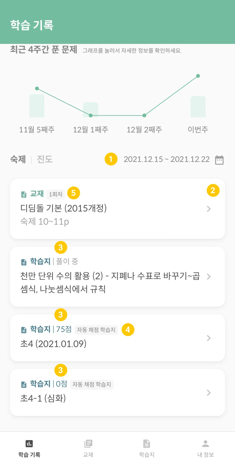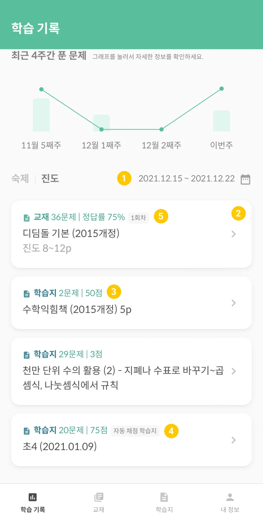 채점된 문제 수와 정답률(교재), 점수(학습지)를 확인할 수 있습니다.