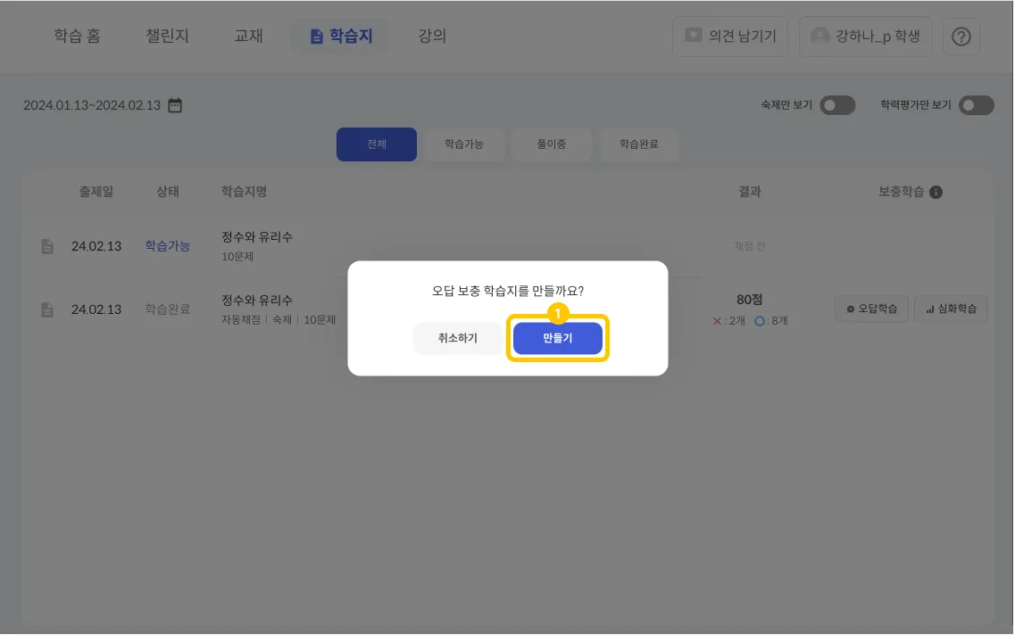 오답학습 버튼을 눌러 보충 학습지 만들기 합니다.