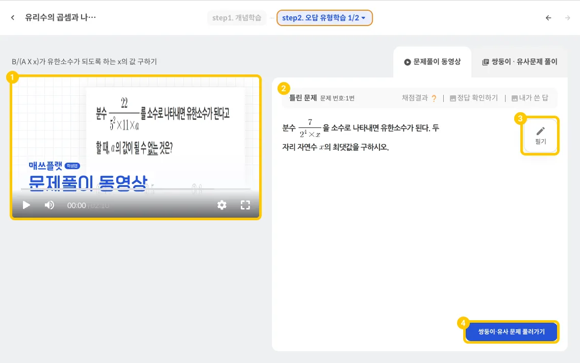 오답 보충 학습은 오답 문제와 관련된 풀이 동영상을 보고 쌍둥이∙유사 문제(총2 문제)를 모두 학습하여 맞으면 완료됩니다.