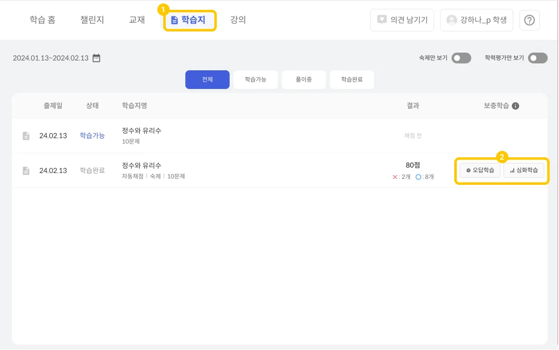 틀린 문제는 오답 학습, 맞은 문제는 심화 학습으로 보충 학습을 진행할 수 있습니다.