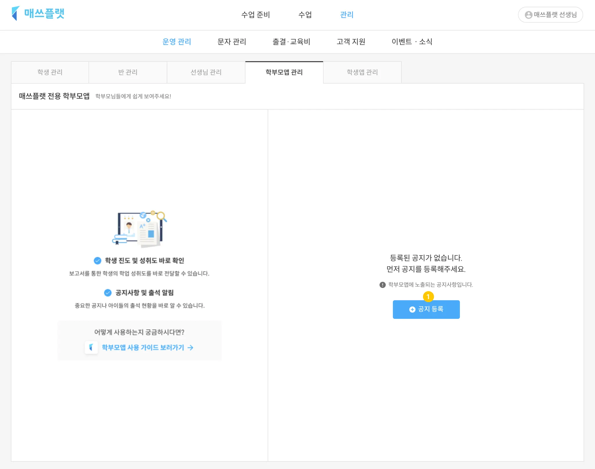 학부모앱 관리에 공지와 학원 소식을 남기시면 학부모앱에서 확인이 가능합니다.