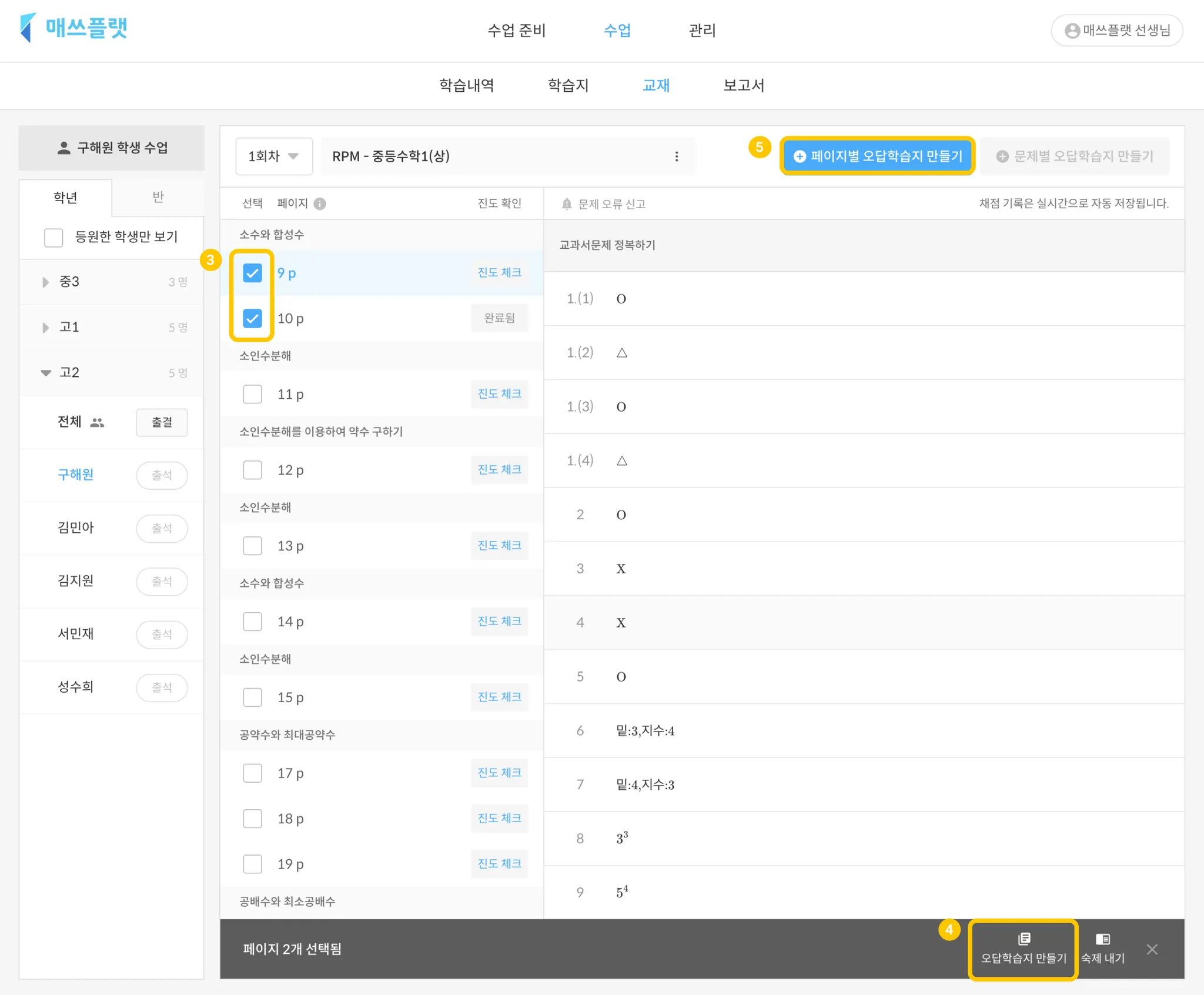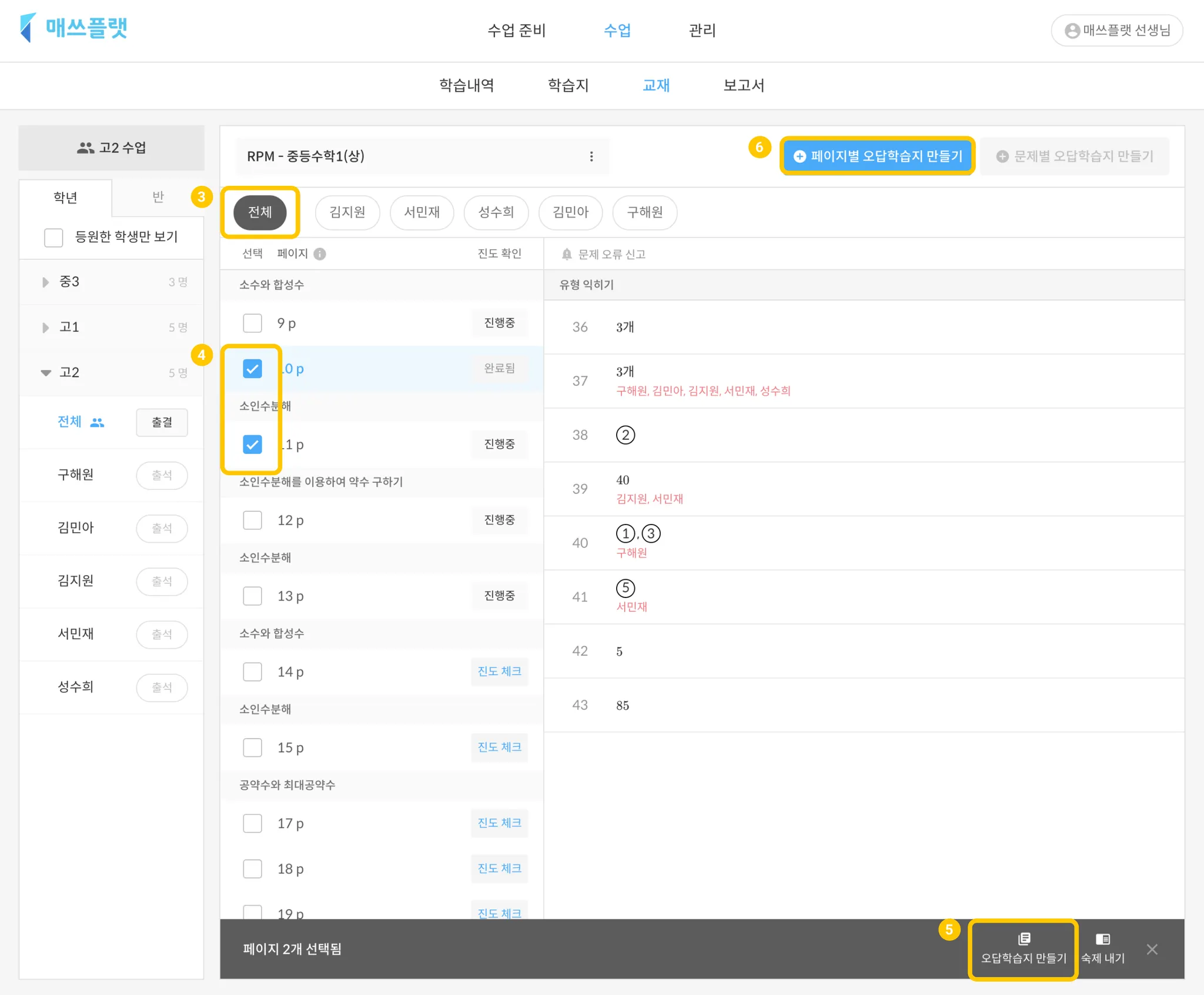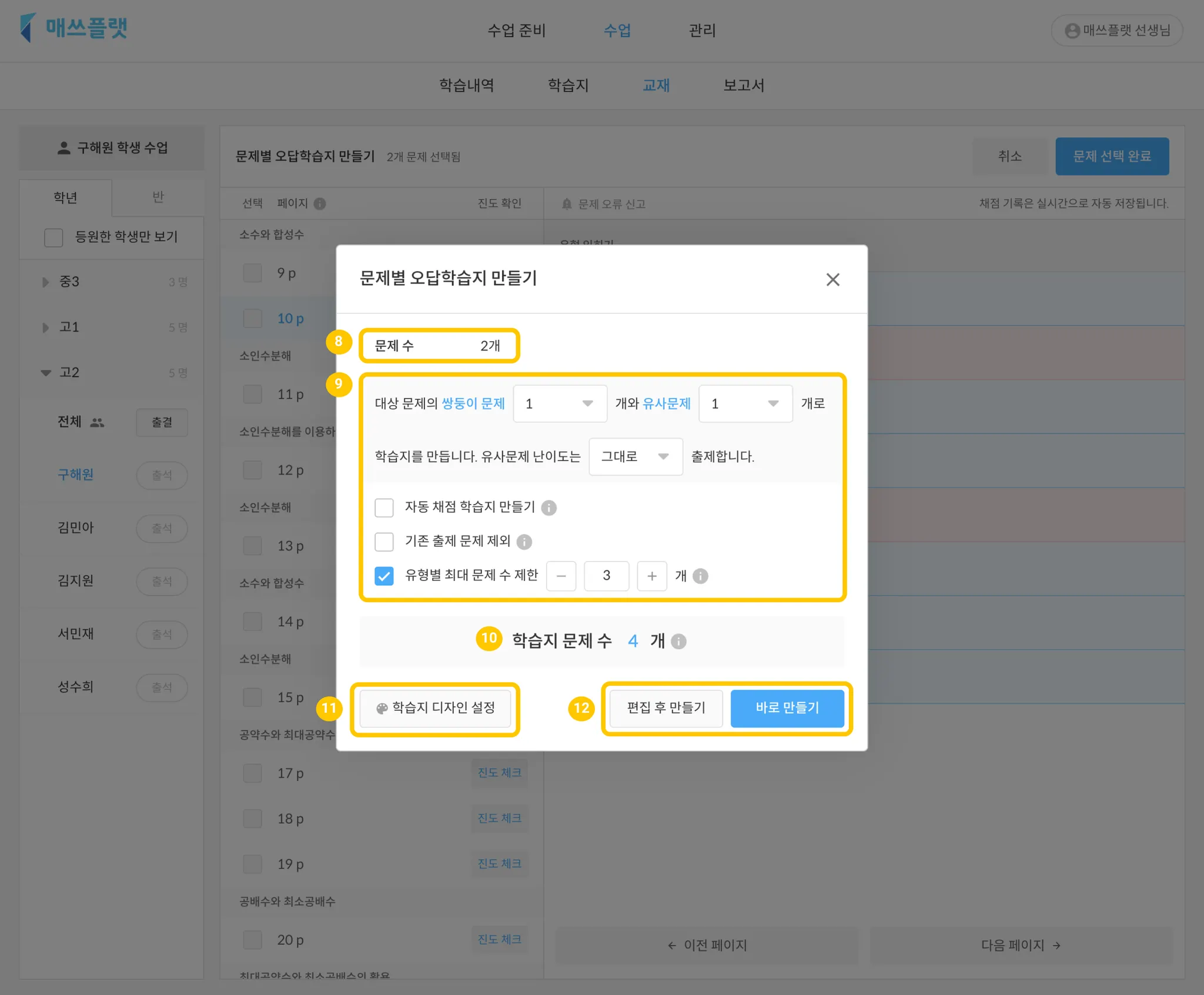 매쓰플랫이 제공하는 교재의 쌍둥이와 유사 문제로 교재 오답학습지를 만들 수 있습니다.