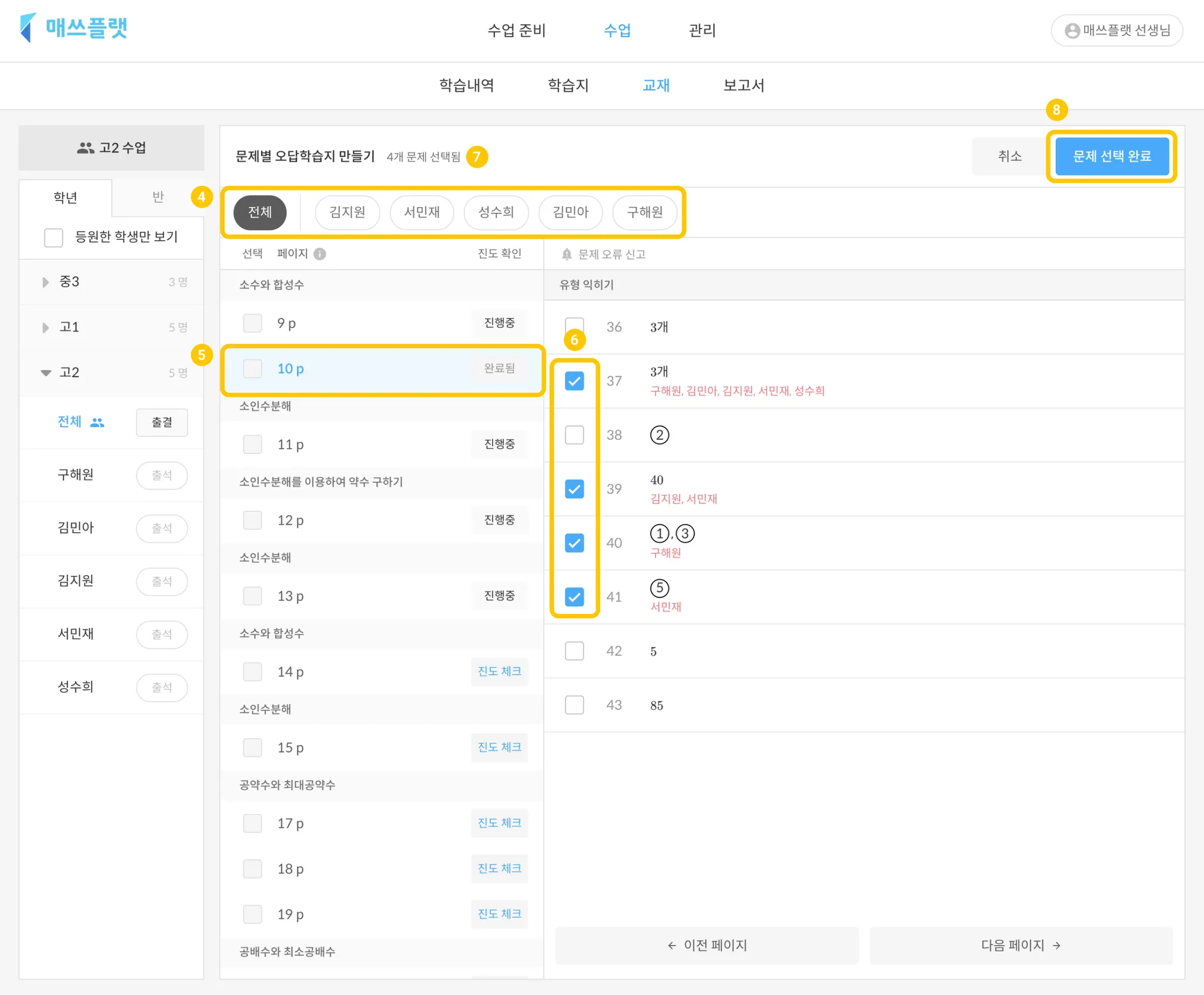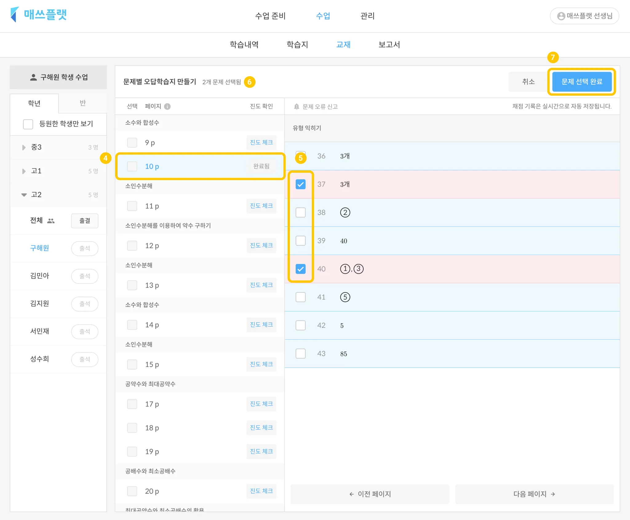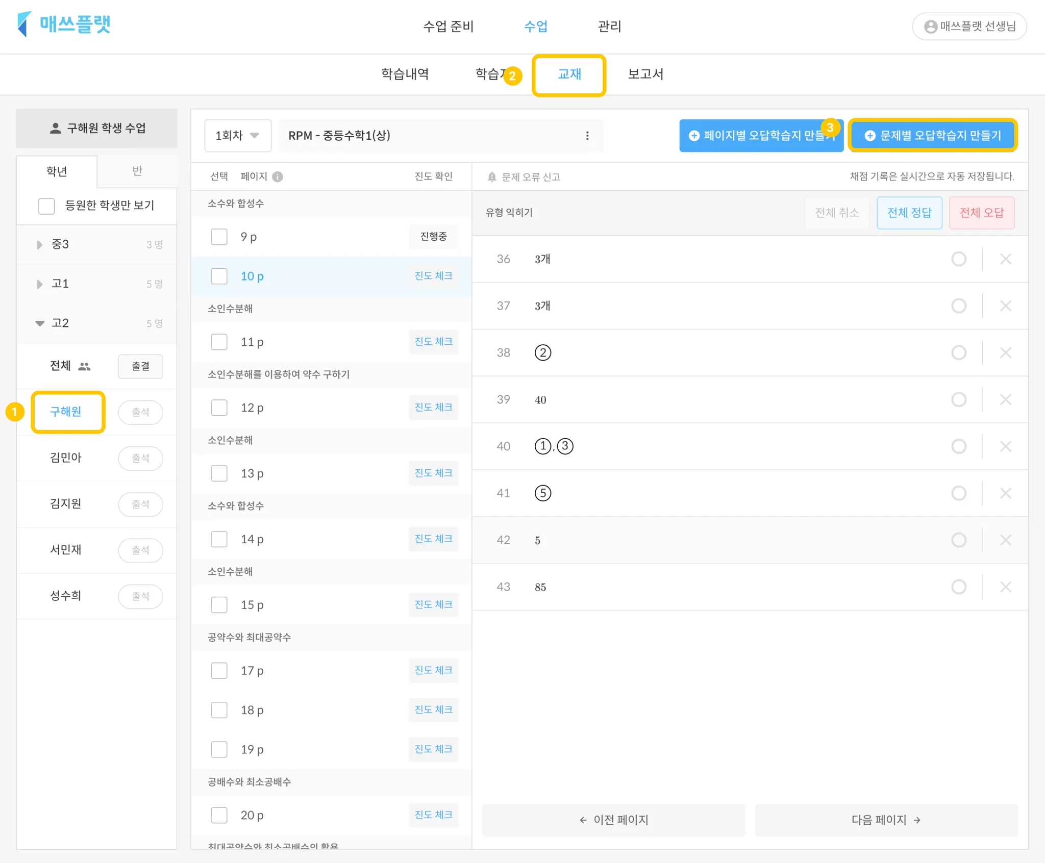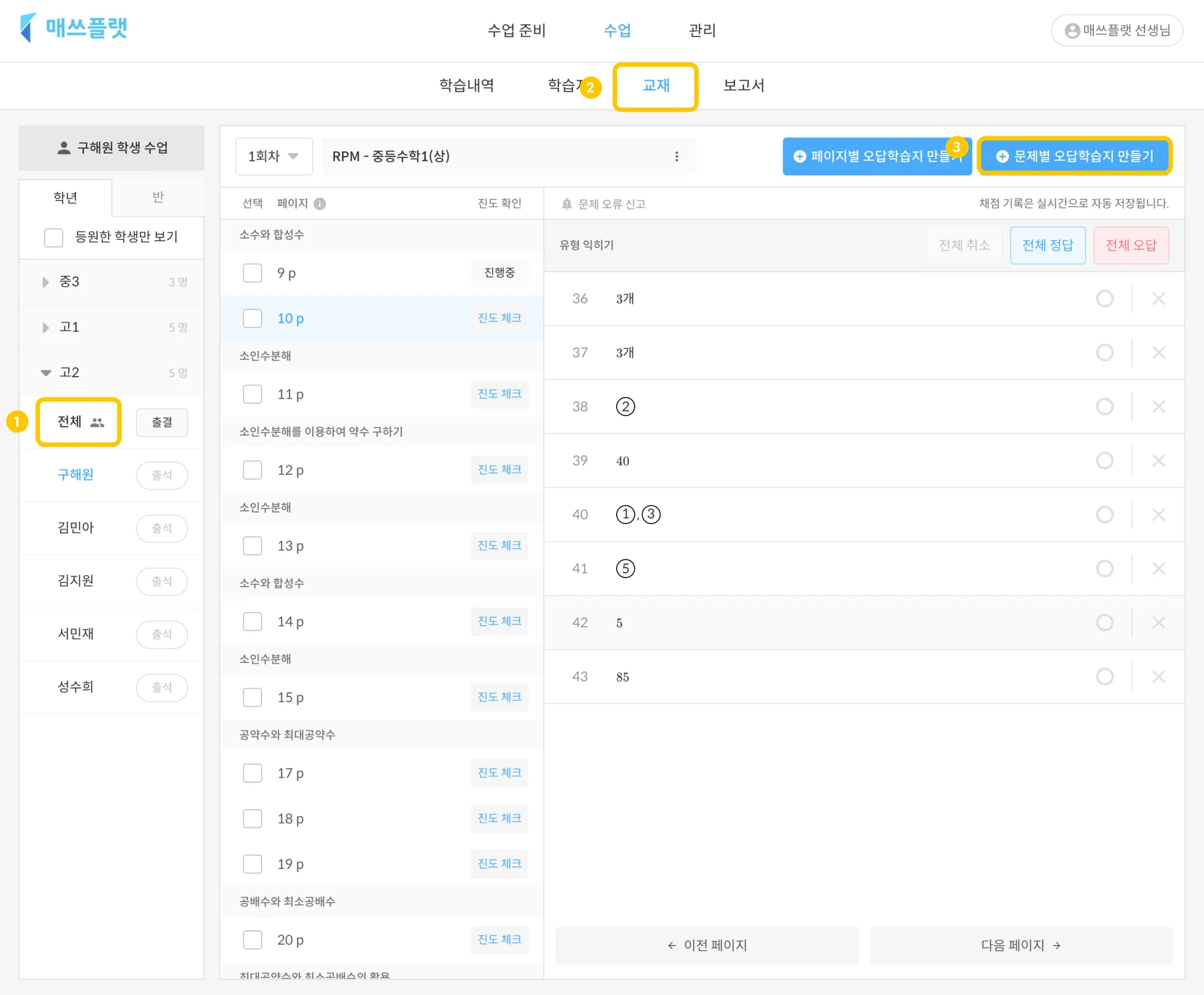 수업 > 학년, 반 또는 학생 선택 > 교재