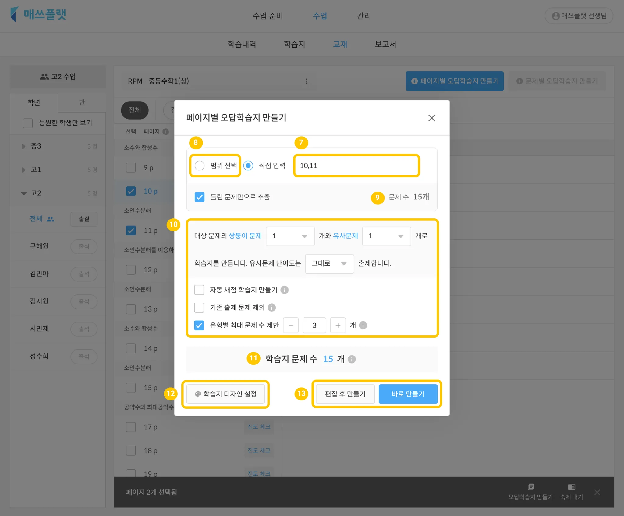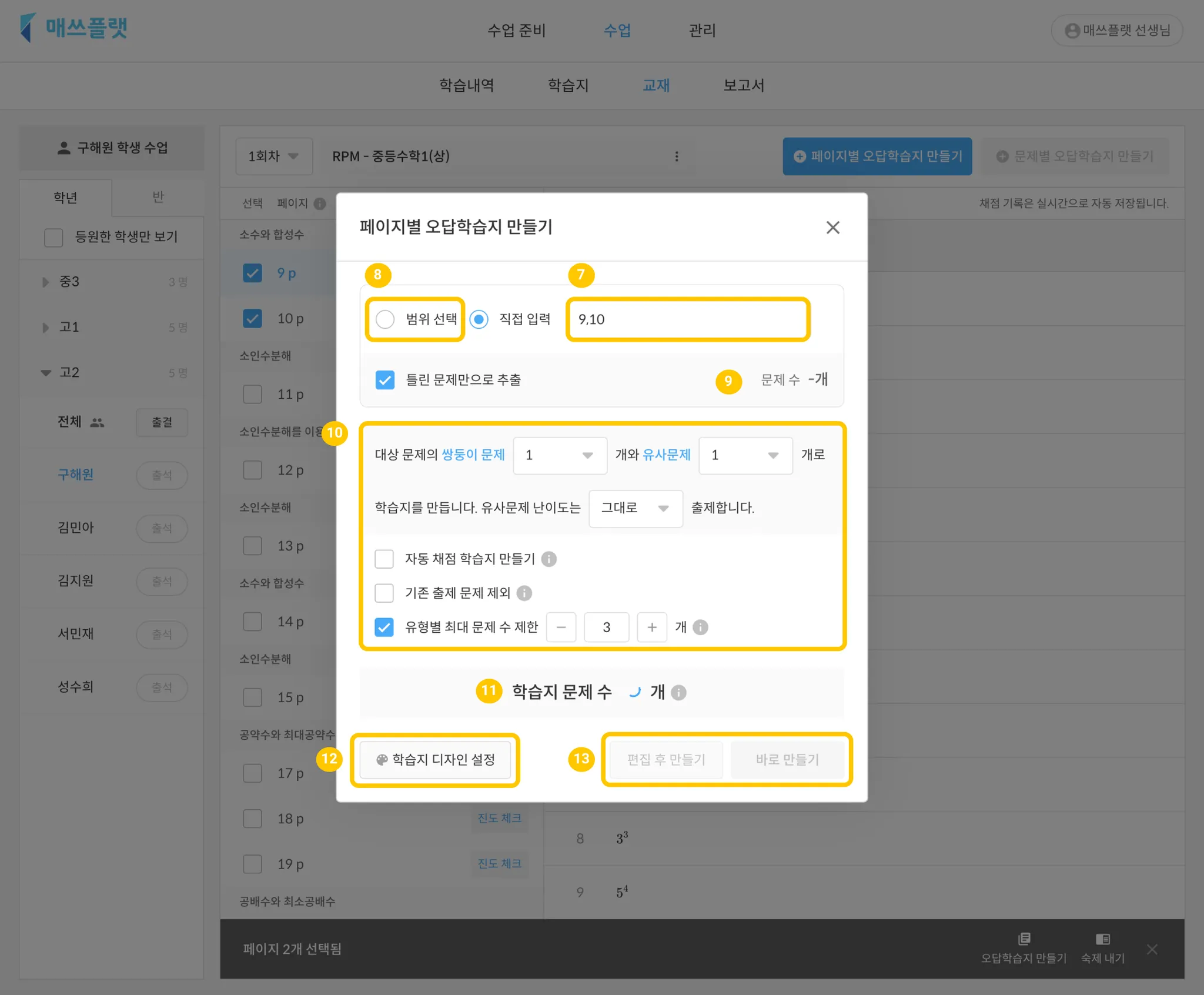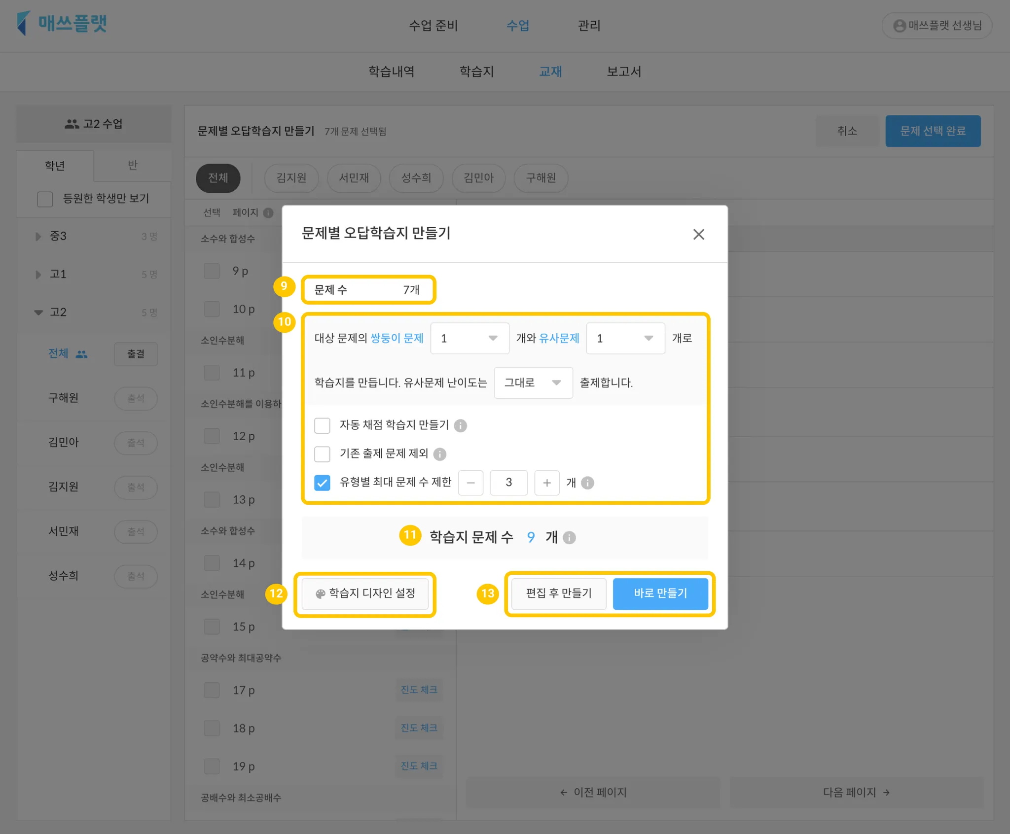 편집 후 만들기 : 학습지 만들기 2단계로 이동되어 오답 학습지에 포함될 문제를 확인 및 편집할 수 있습니다.