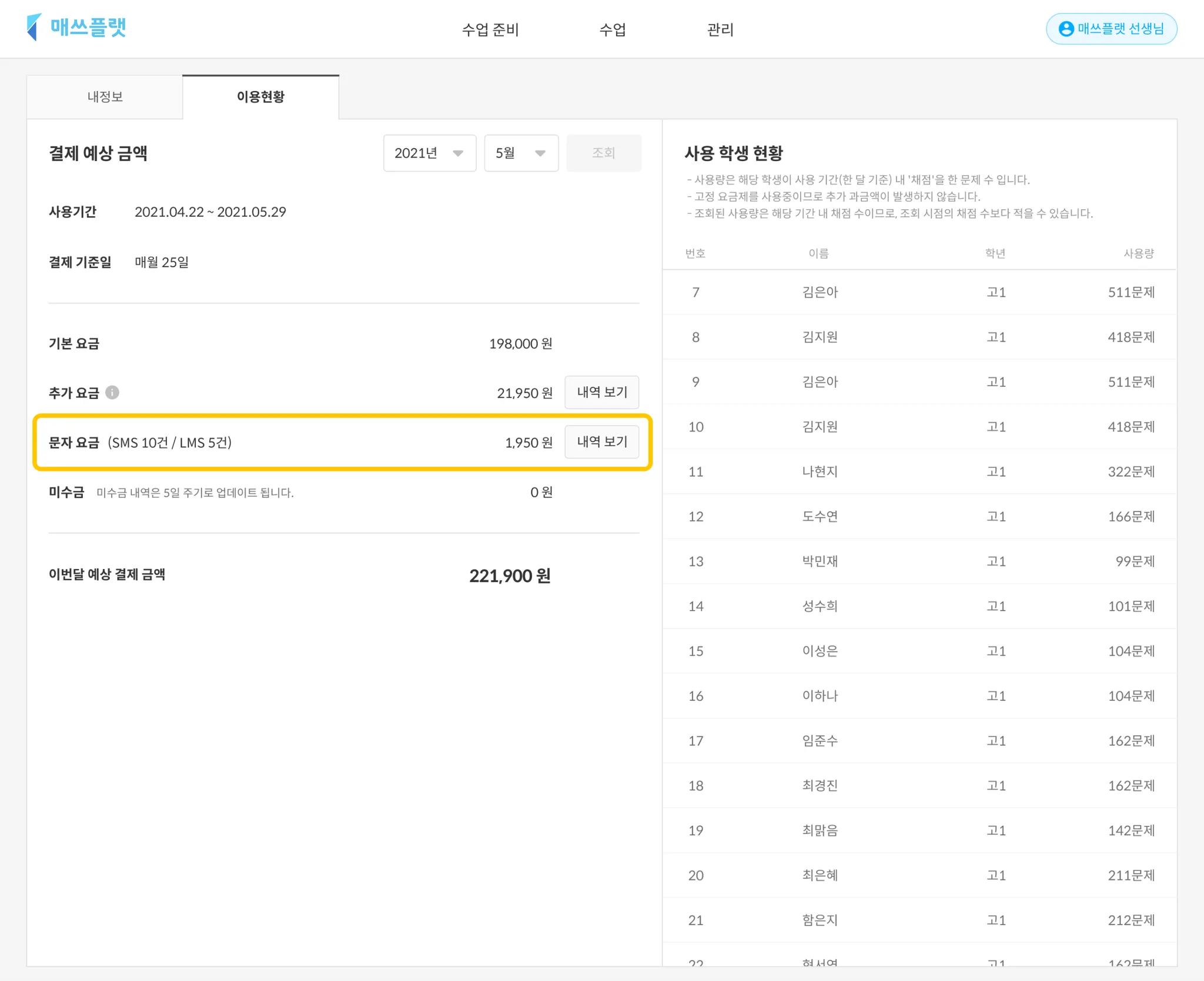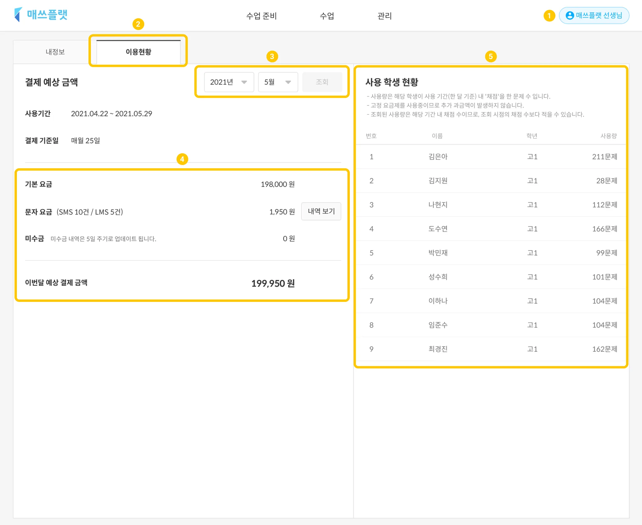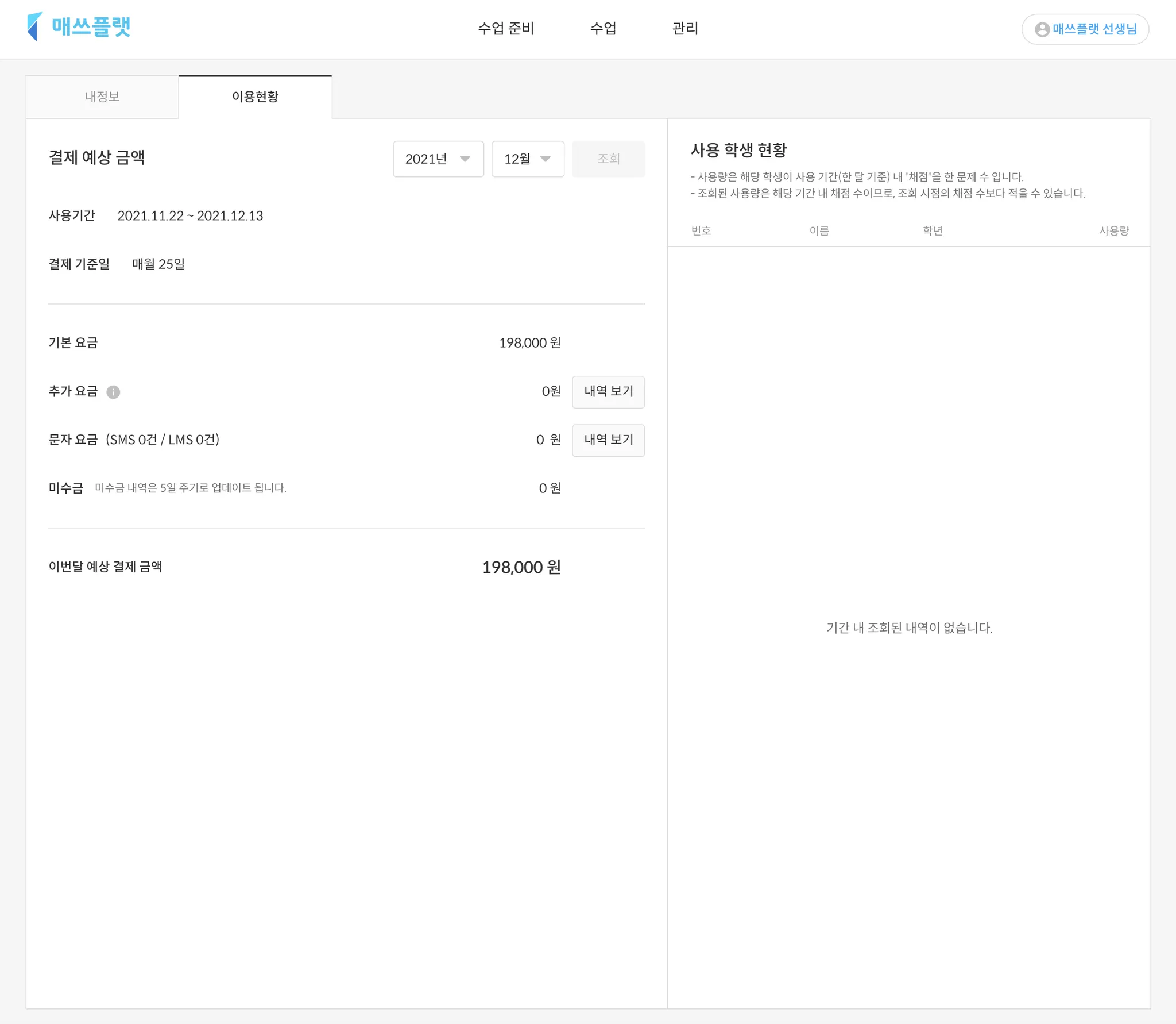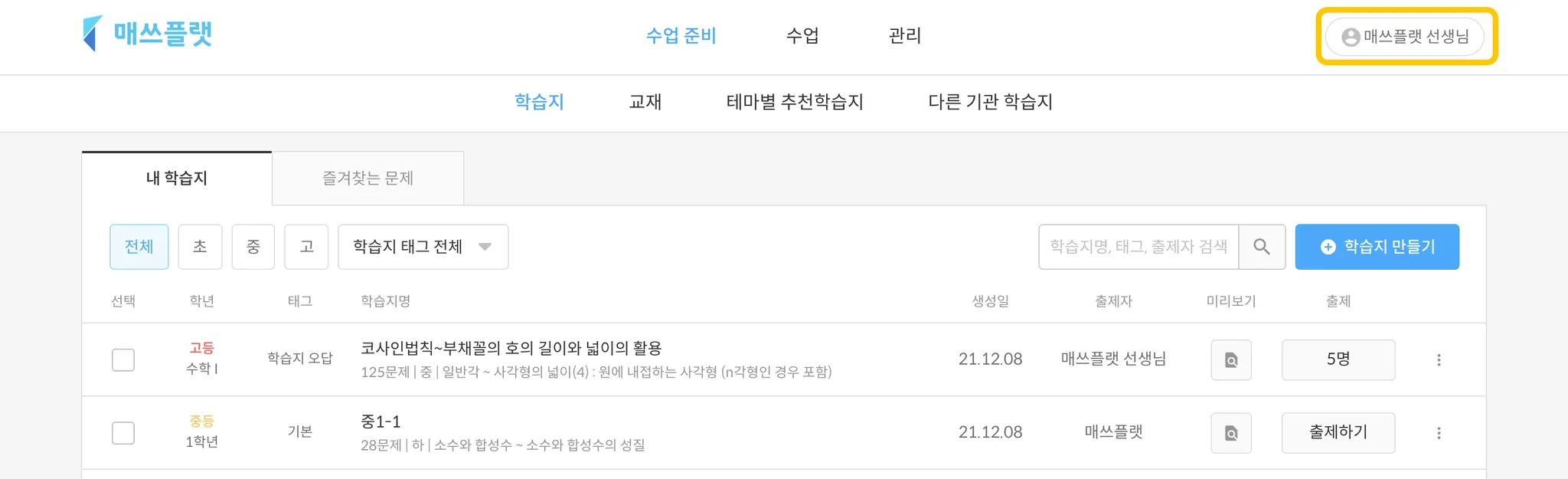 매쓰플랫 사이트 우측 최상단 선생님 이름을 누르면 내 정보 화면으로 이동합니다.