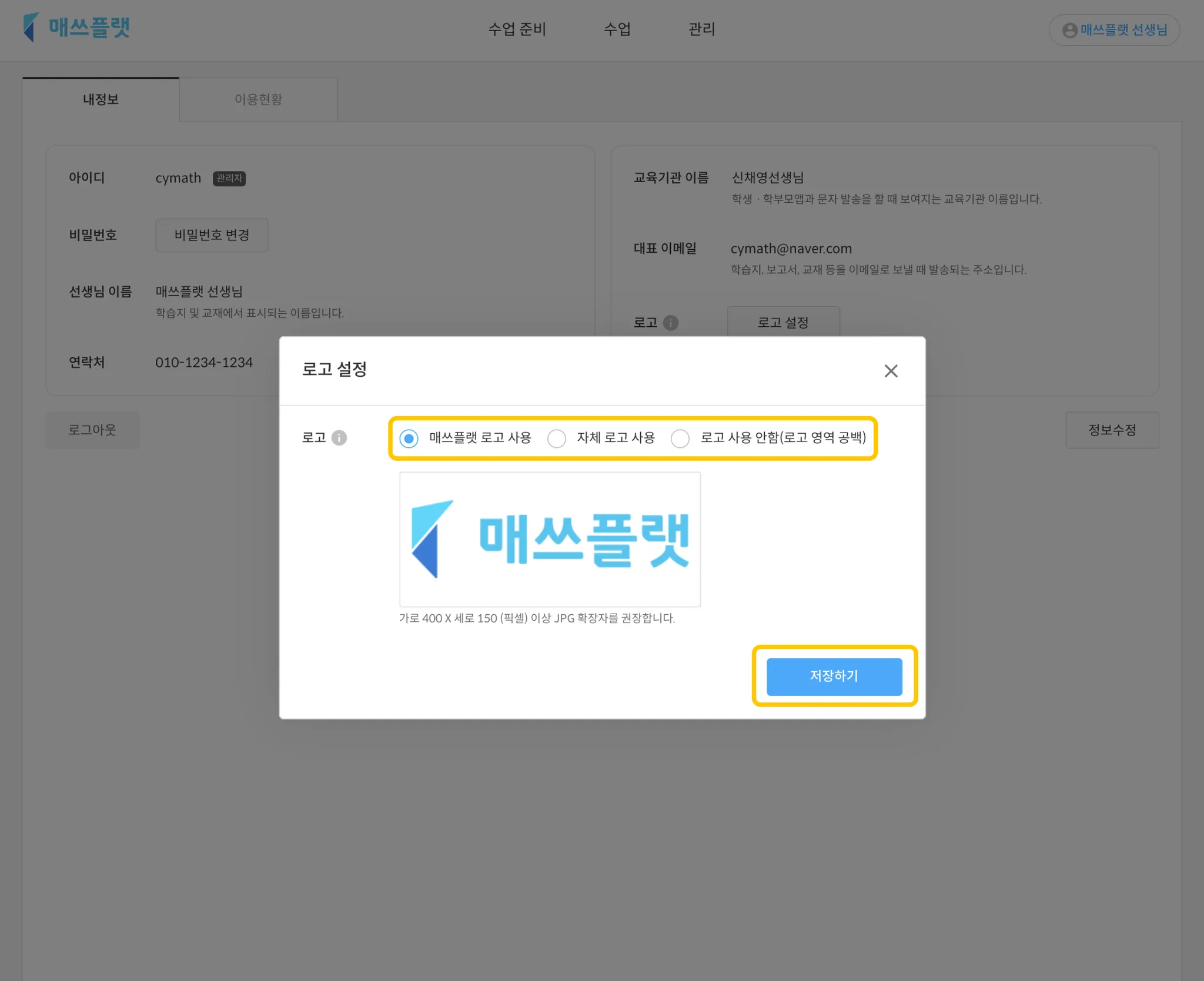 학원 로고를 설정 및 변경하고 싶은 경우 로고 설정 버튼을 눌러주세요.
