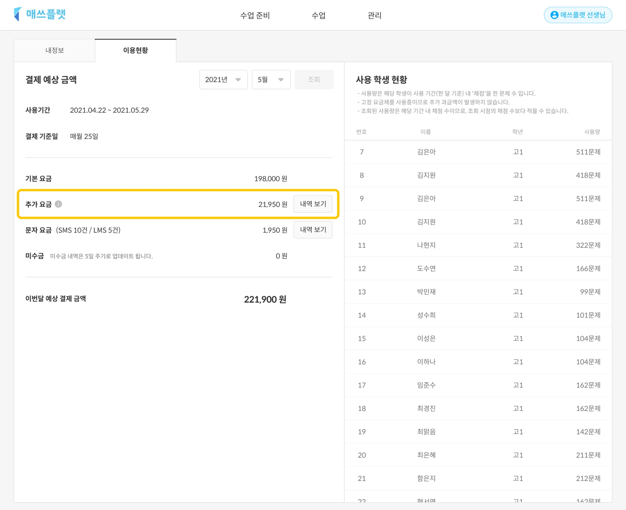 인당 추가금(*n원/인당)이 발생하며 이는 이용료와 함께 청구됩니다.