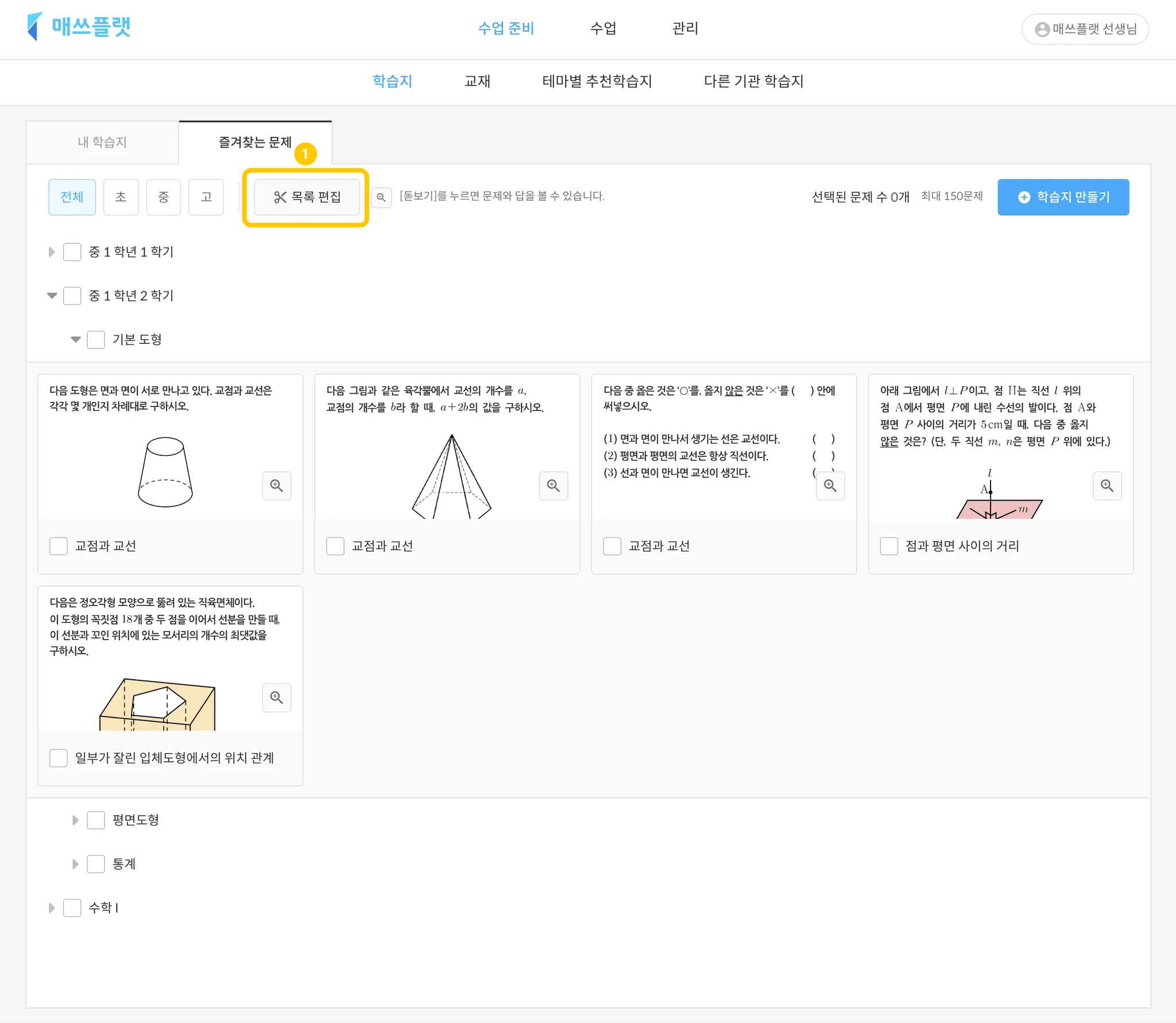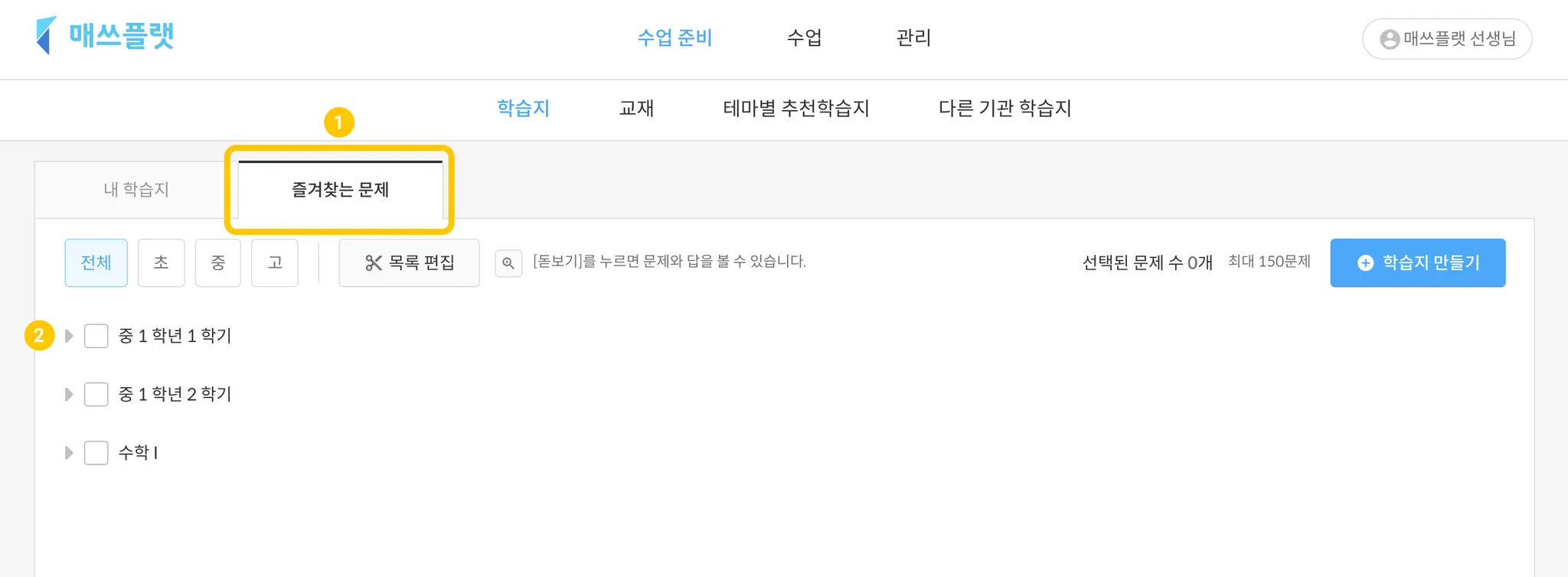 [수업 준비] - [학습지]에 들어간 후, [즐겨찾는 문제] 탭에 들어갑니다.