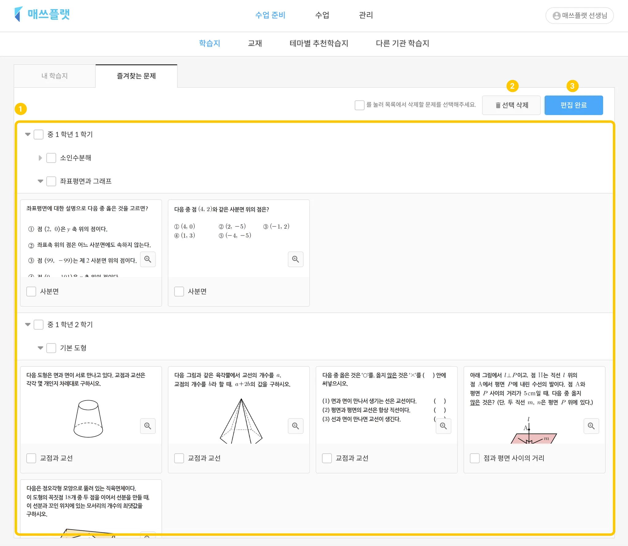 즐겨 찾기한 문제의 학년학기/과목 이름을 확인할 수 있습니다.