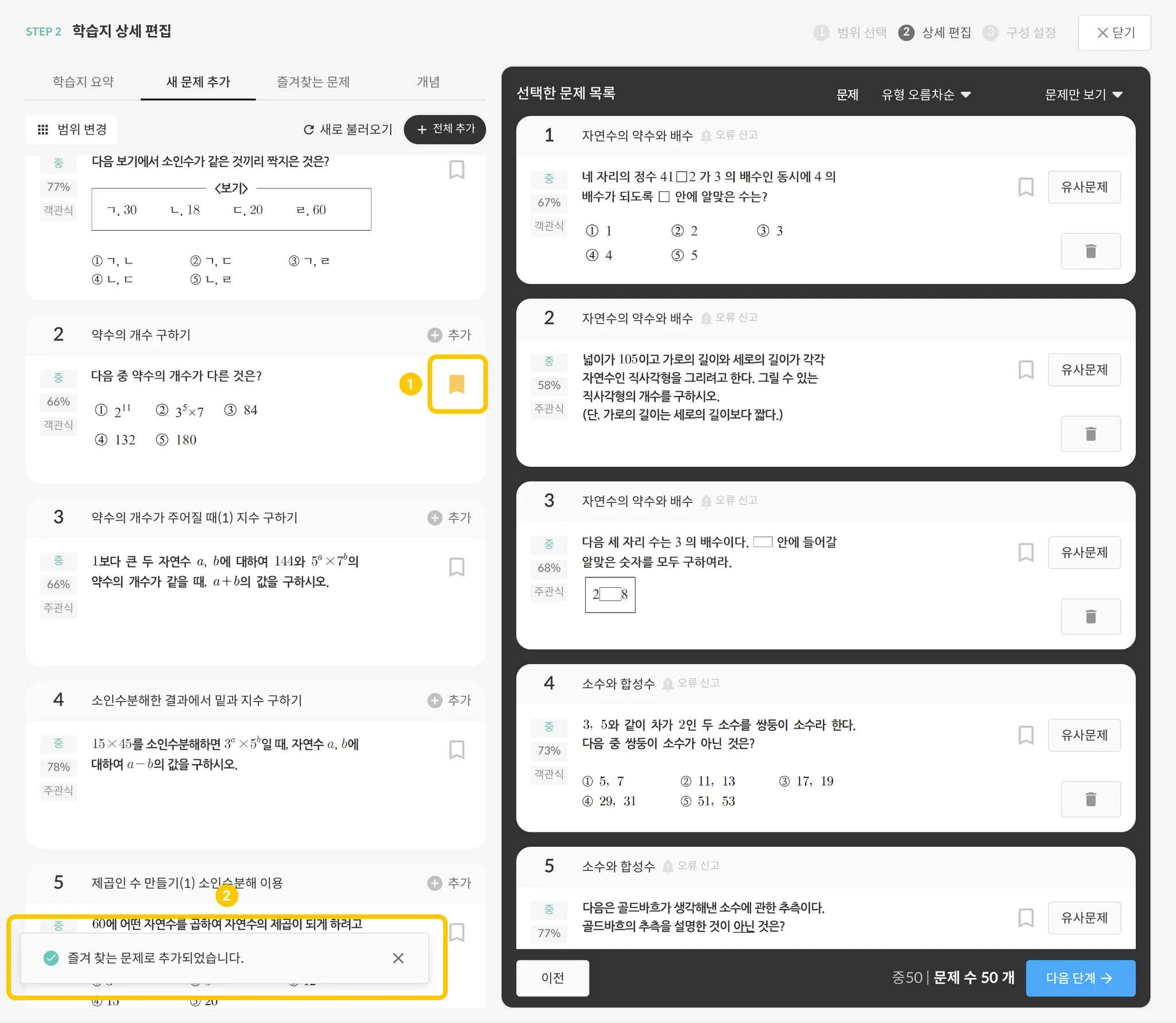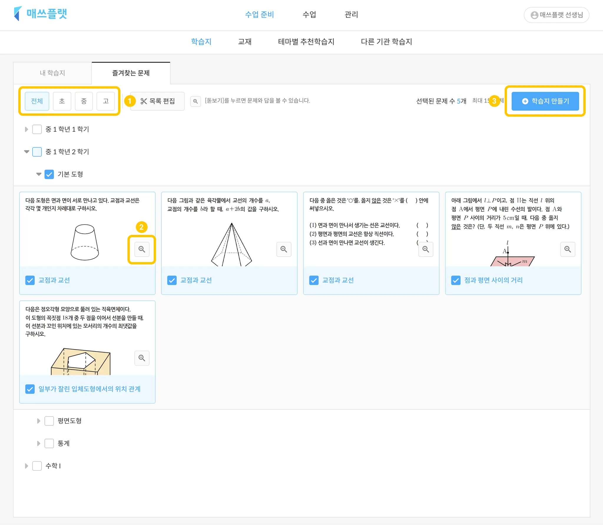 학습지 만들기 STEP 2 > 즐겨 찾는 문제 탭