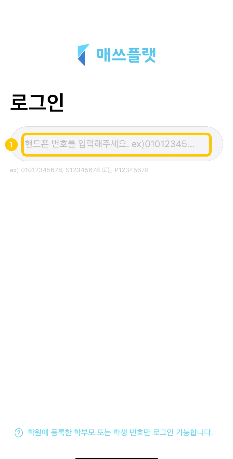 매쓰플랫 앱을 실행한 후 학생 또는 학부모님의 핸드폰 번호를 입력합니다.