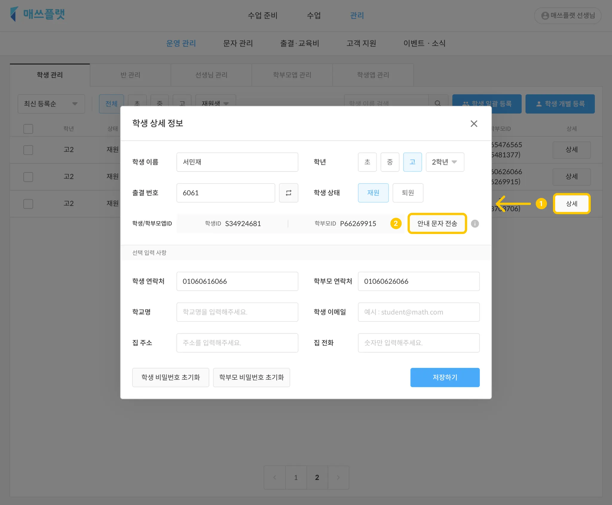 [관리] - [운영관리] - [학생 관리] 탭에 들어가, 상세 버튼을 누릅니다.