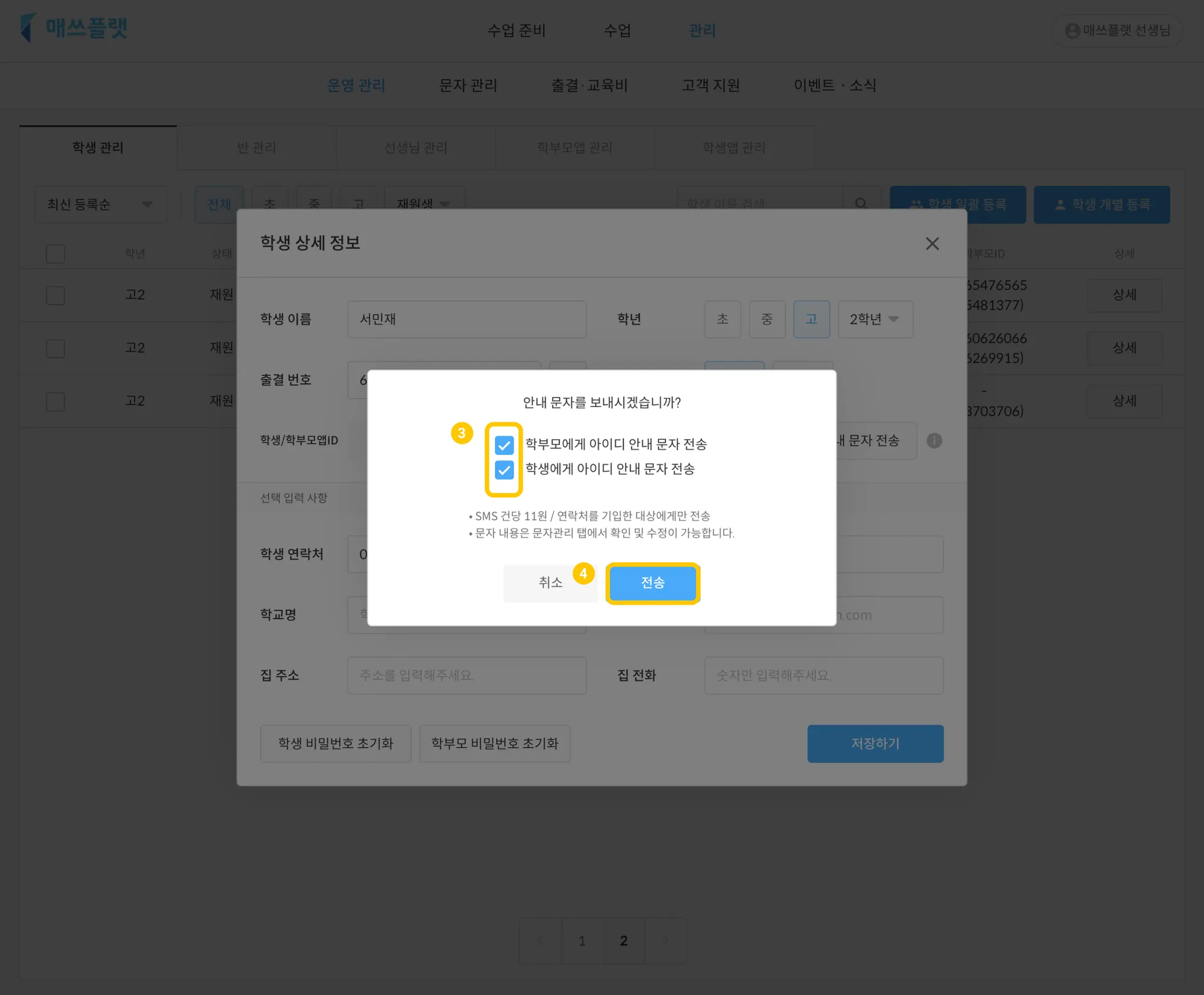 안내 문자는 문자 탬플릿 중 학부모 아이디 안내, 학생 아이디 안내 탬플릿 문자가 전송됩니다.