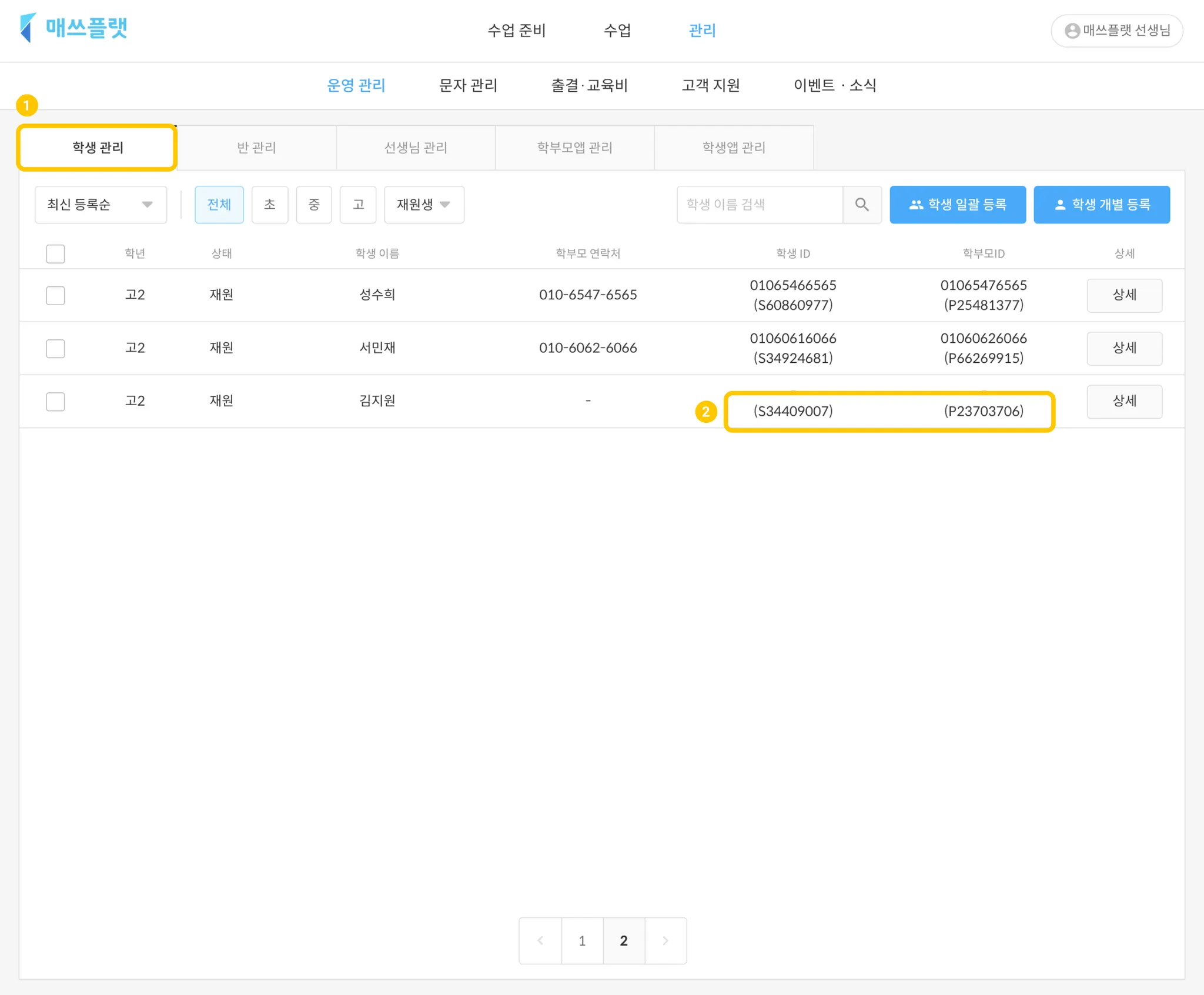 [관리] - [운영관리] - [학생 관리] 탭에 들어갑니다.