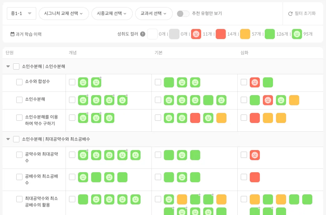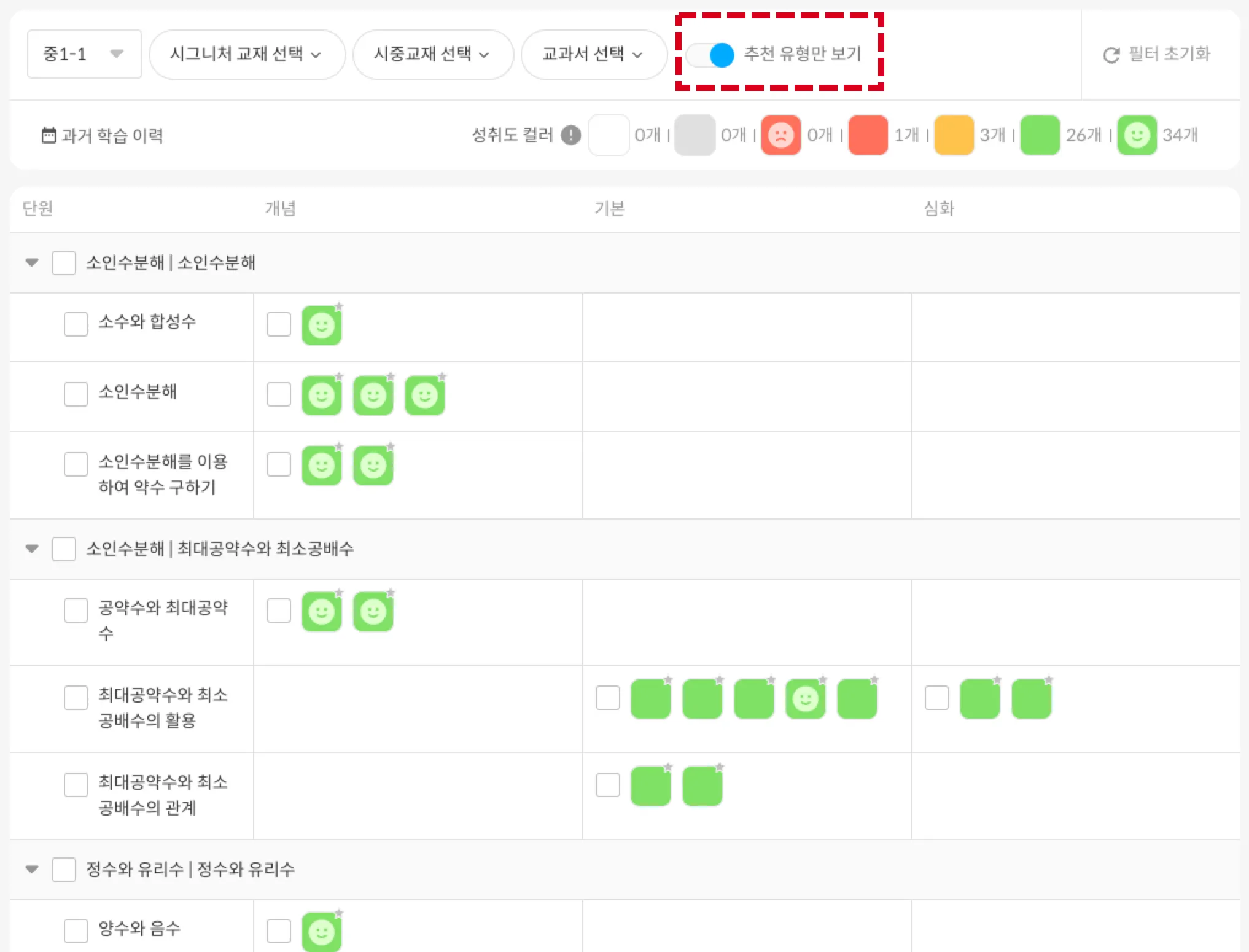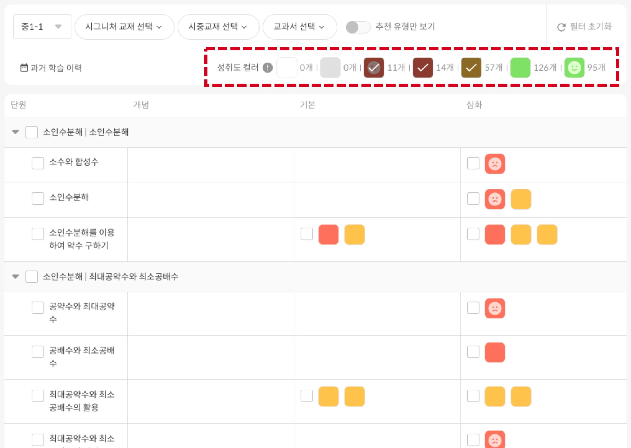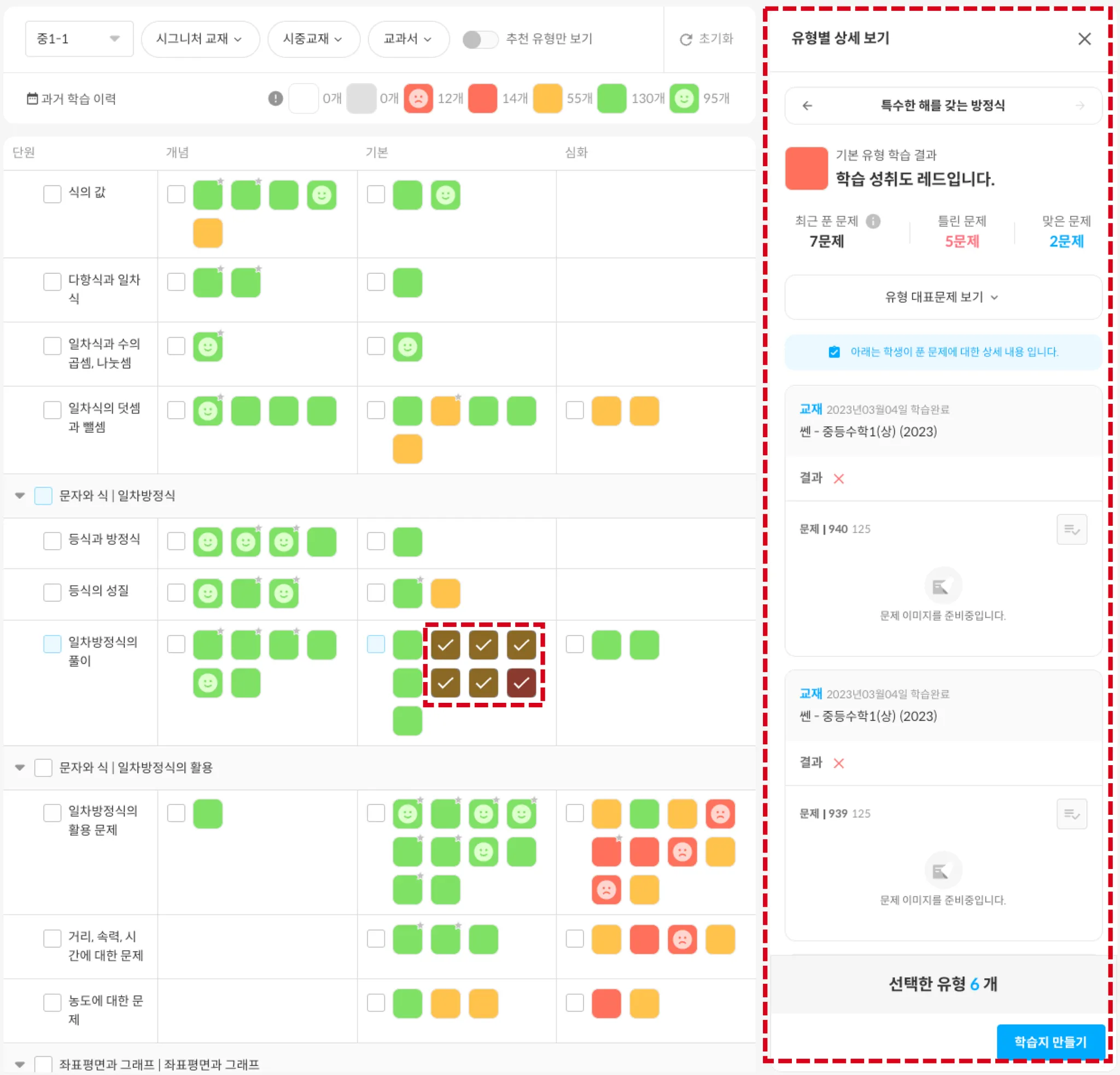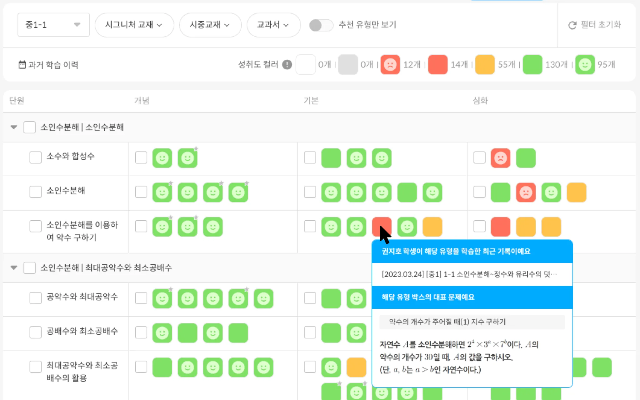 즉, 같은 유형이라도 어려운 난이도에서는 학생이 어려워할 수 있으니, 그런 유형들만 골라서 관리할 수 있습니다.