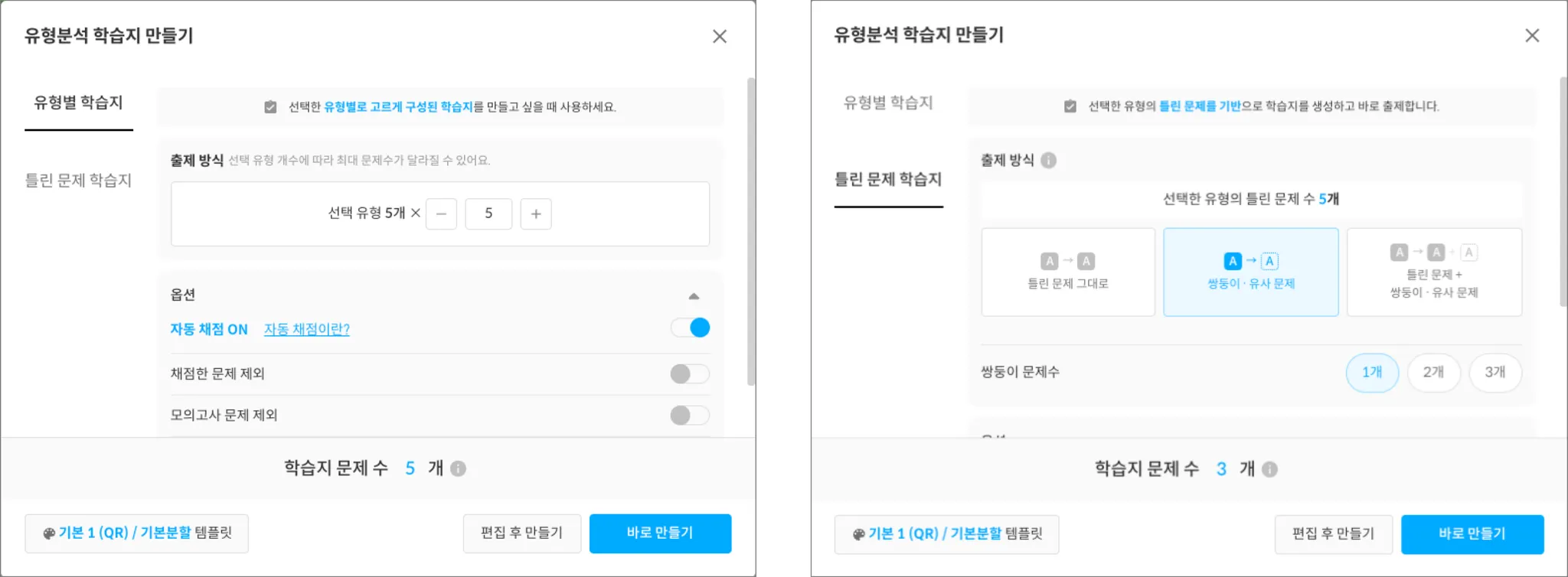 ‘유형분석’에서 2종류의 학습지 만들기가 가능합니다.