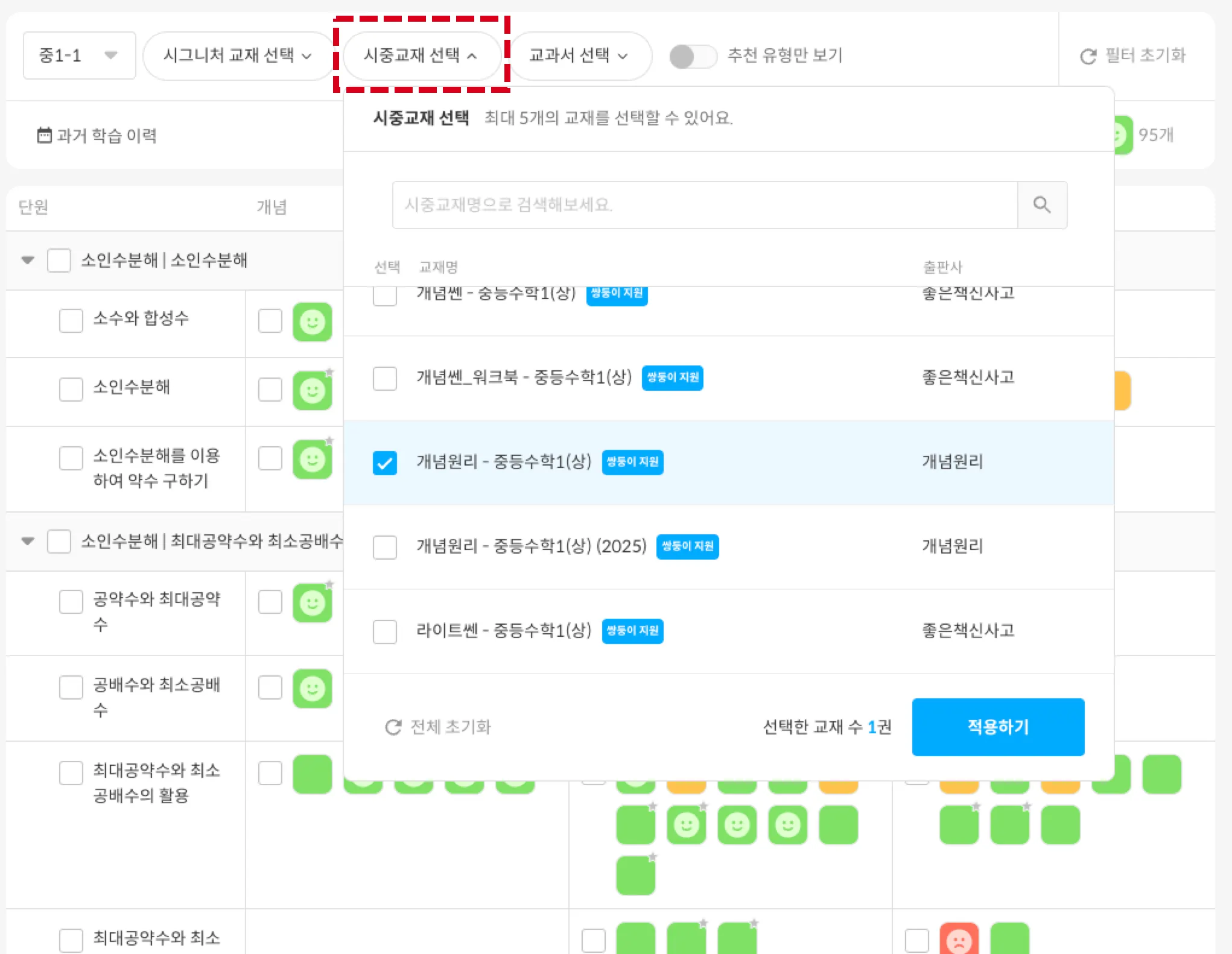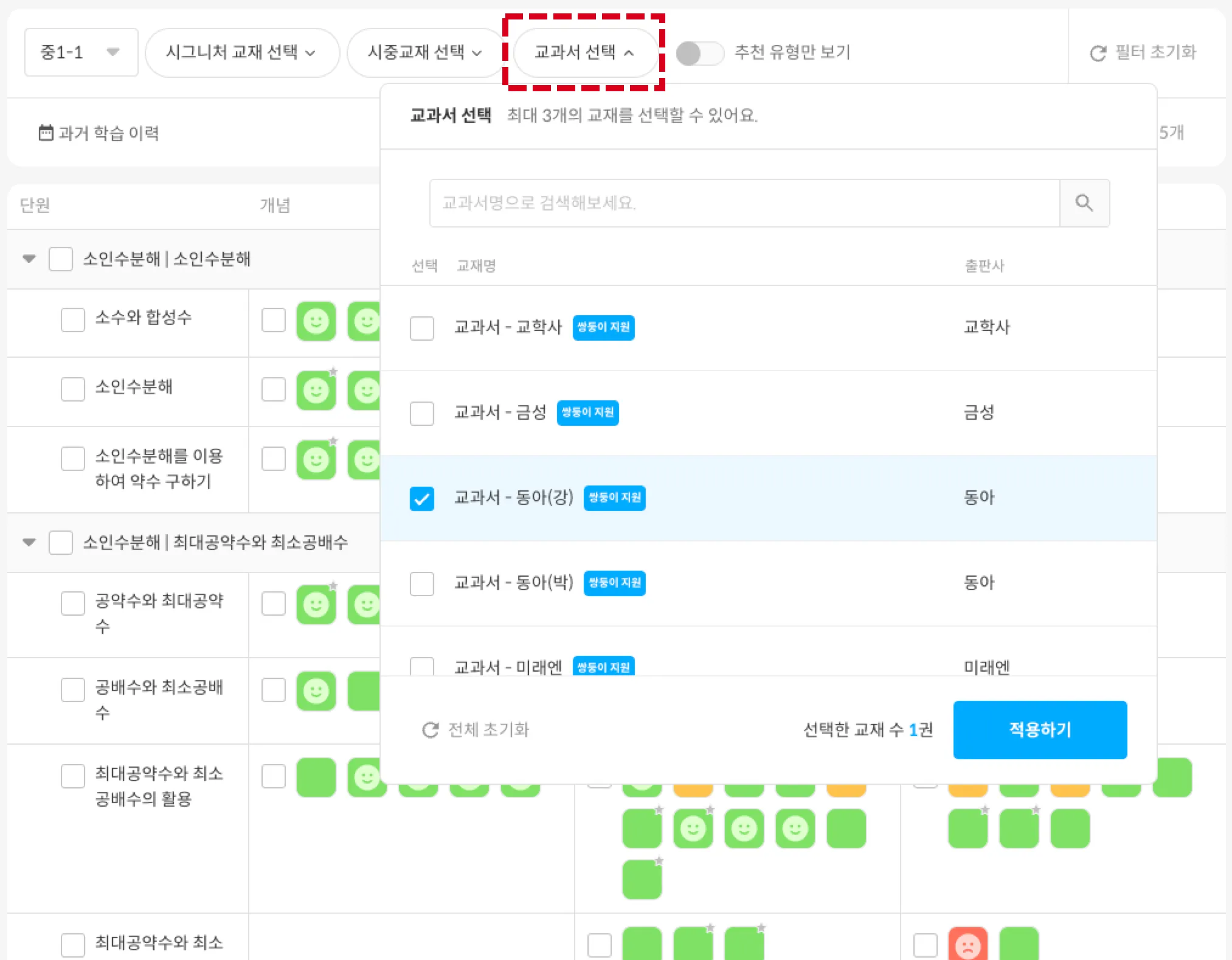 교과서 필터에서 학생별 교과서를 선택해보세요.