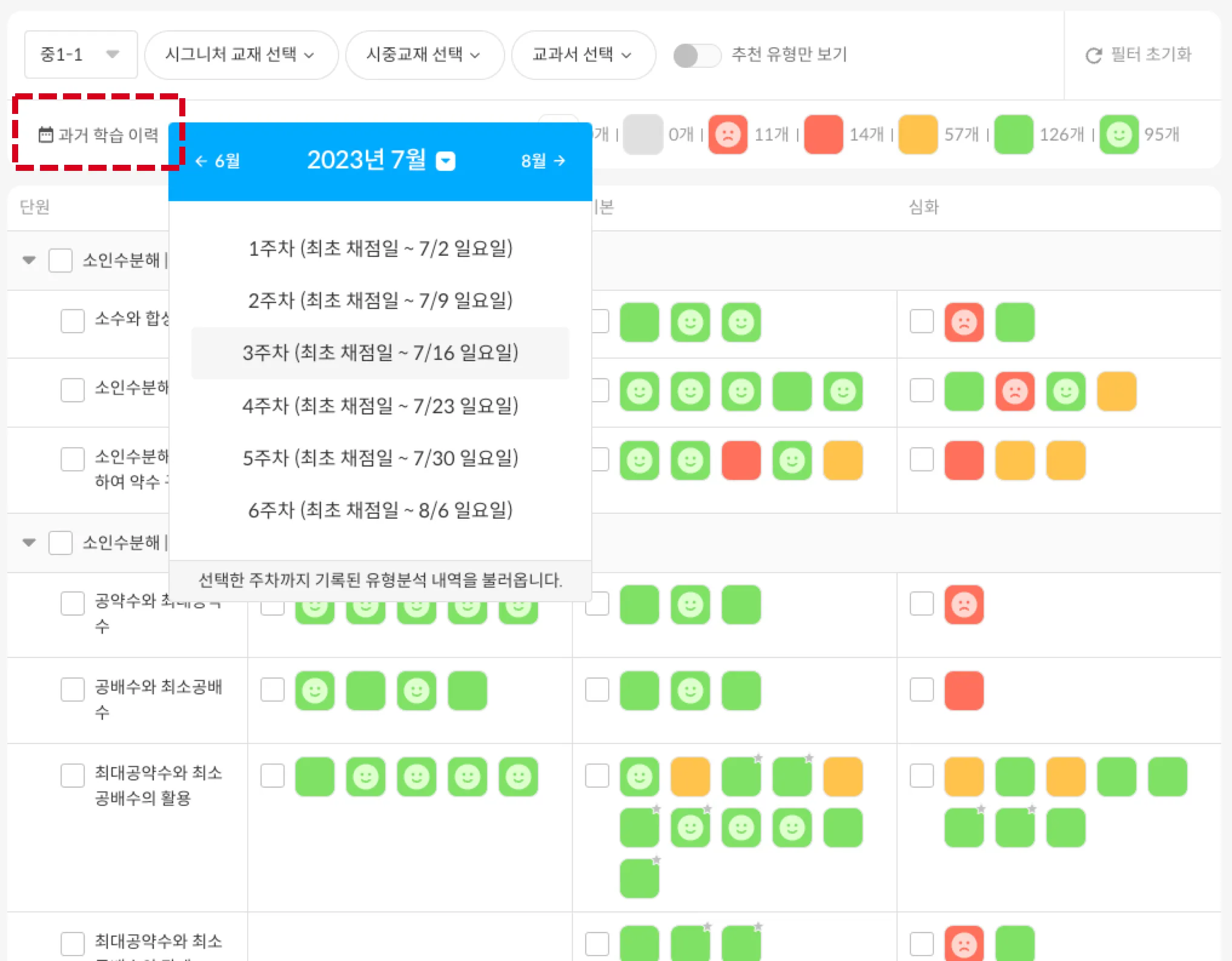 과거 학습 이력 기능을 통해, 현재와 과거의 성취도를 비교해보세요.