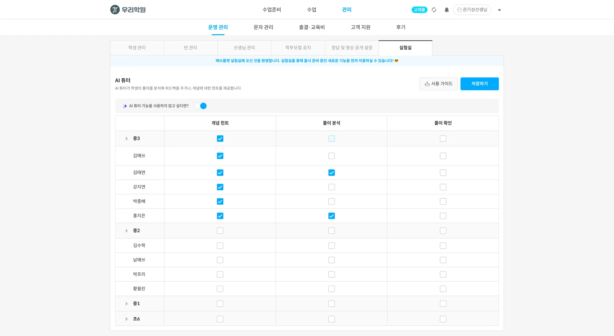 학생별 AI 튜터 권한을 ON/OFF 할 수 있습니다.