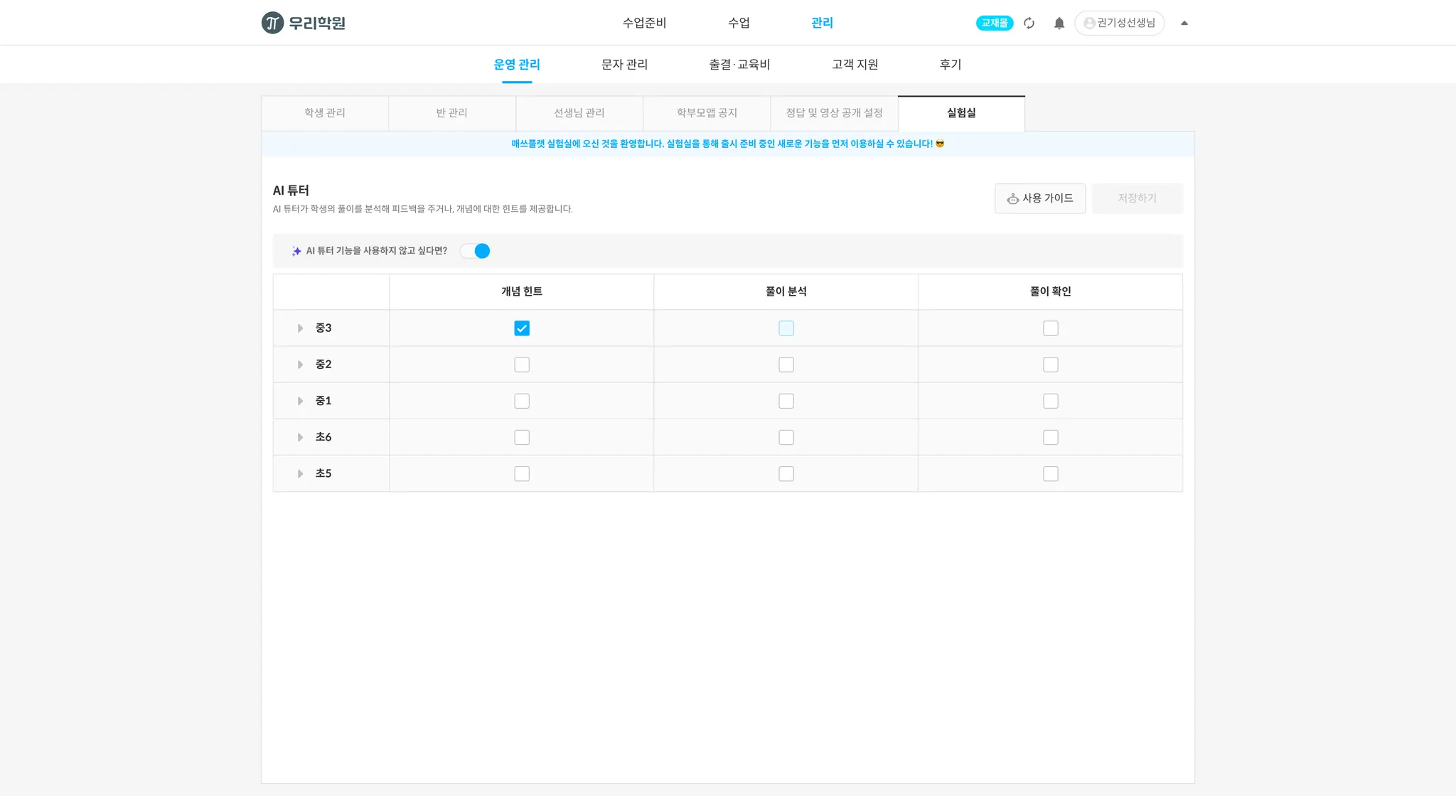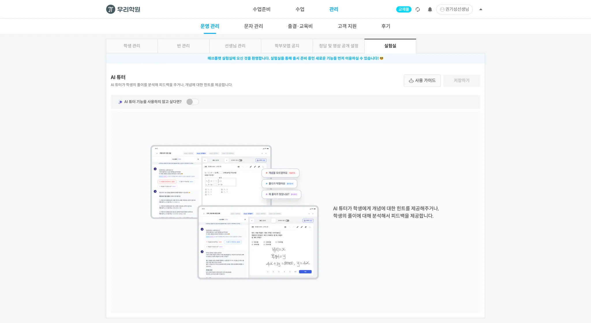 학원 전체 AI 튜터 권한을 ON/OFF 할 수 있습니다.