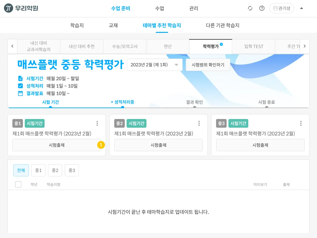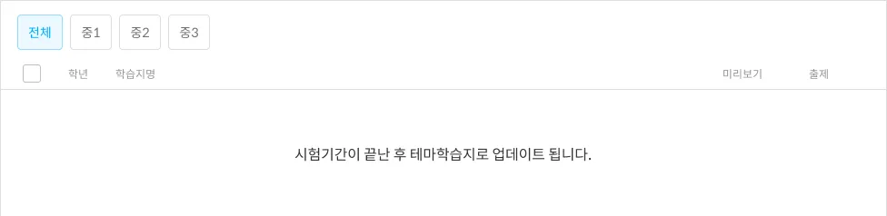 시험 종료가 되었을 경우에만 해당 목록에 학습지가 생성됩니다.
