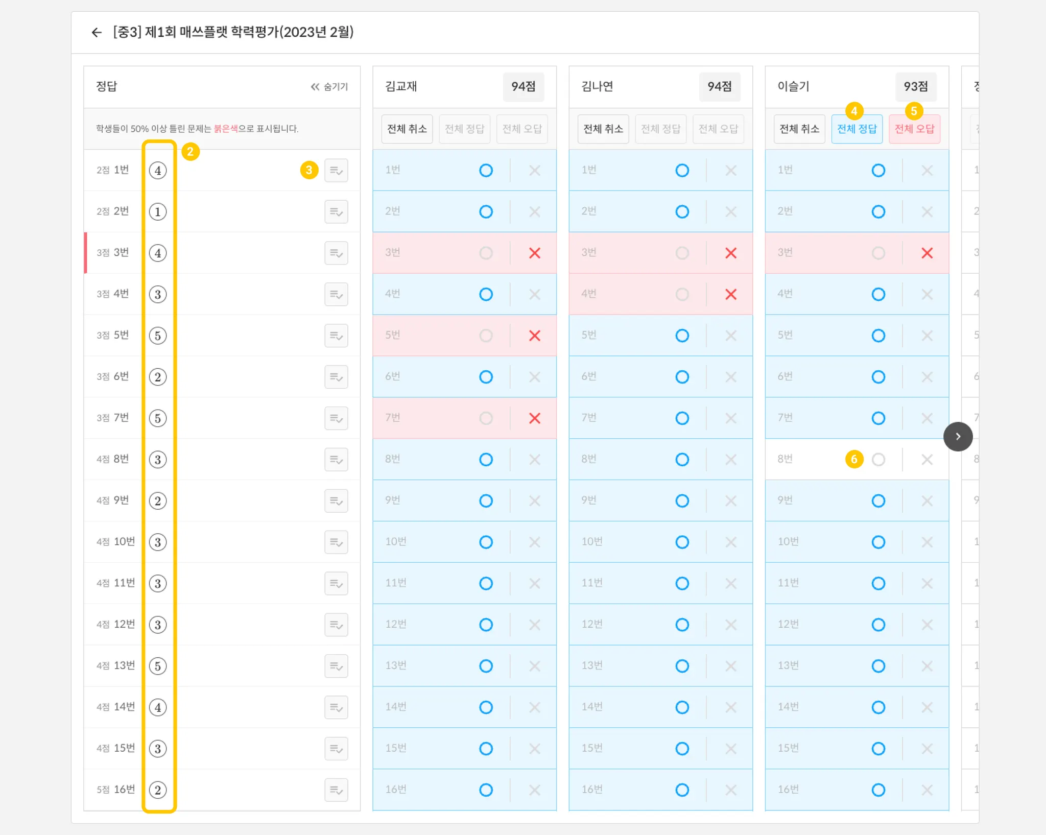 해당 학생의 모든 답안을 정답처리합니다.