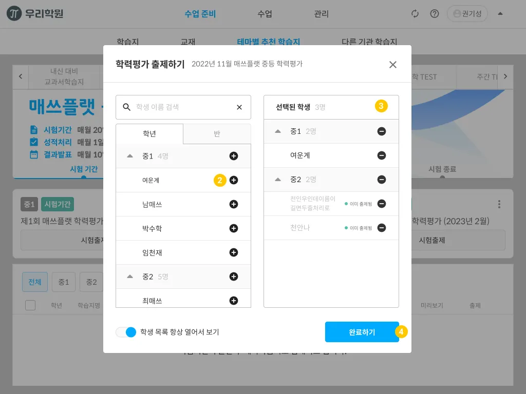 출제를 원하는 학생을 모두 추가하였다면 완료하기 버튼을 선택하여 출제를 마무리합니다.