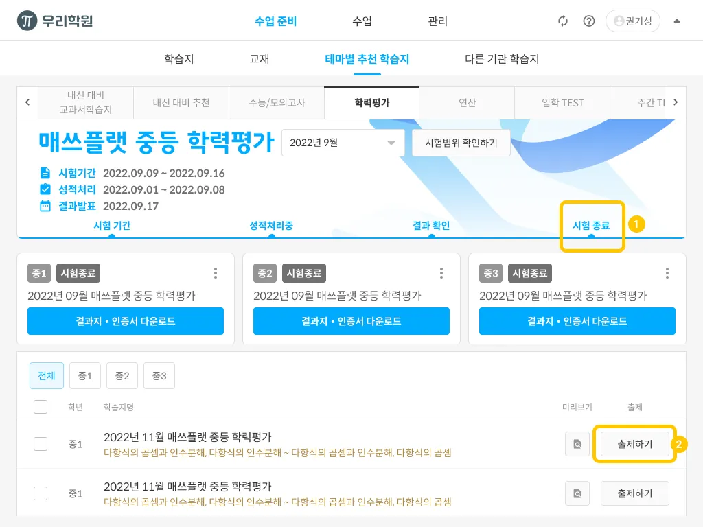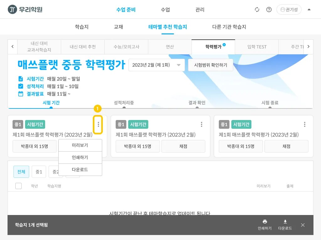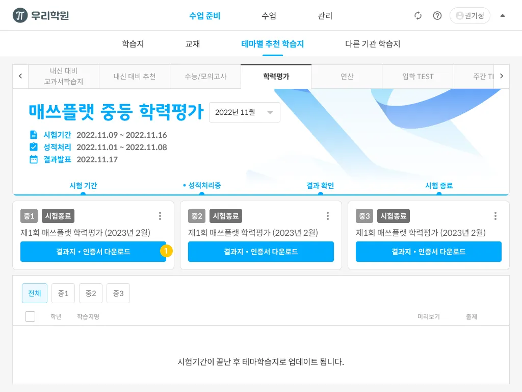 시험 종료 상태가 되면 하단에 학습지 목록이 활성화 됩니다.
