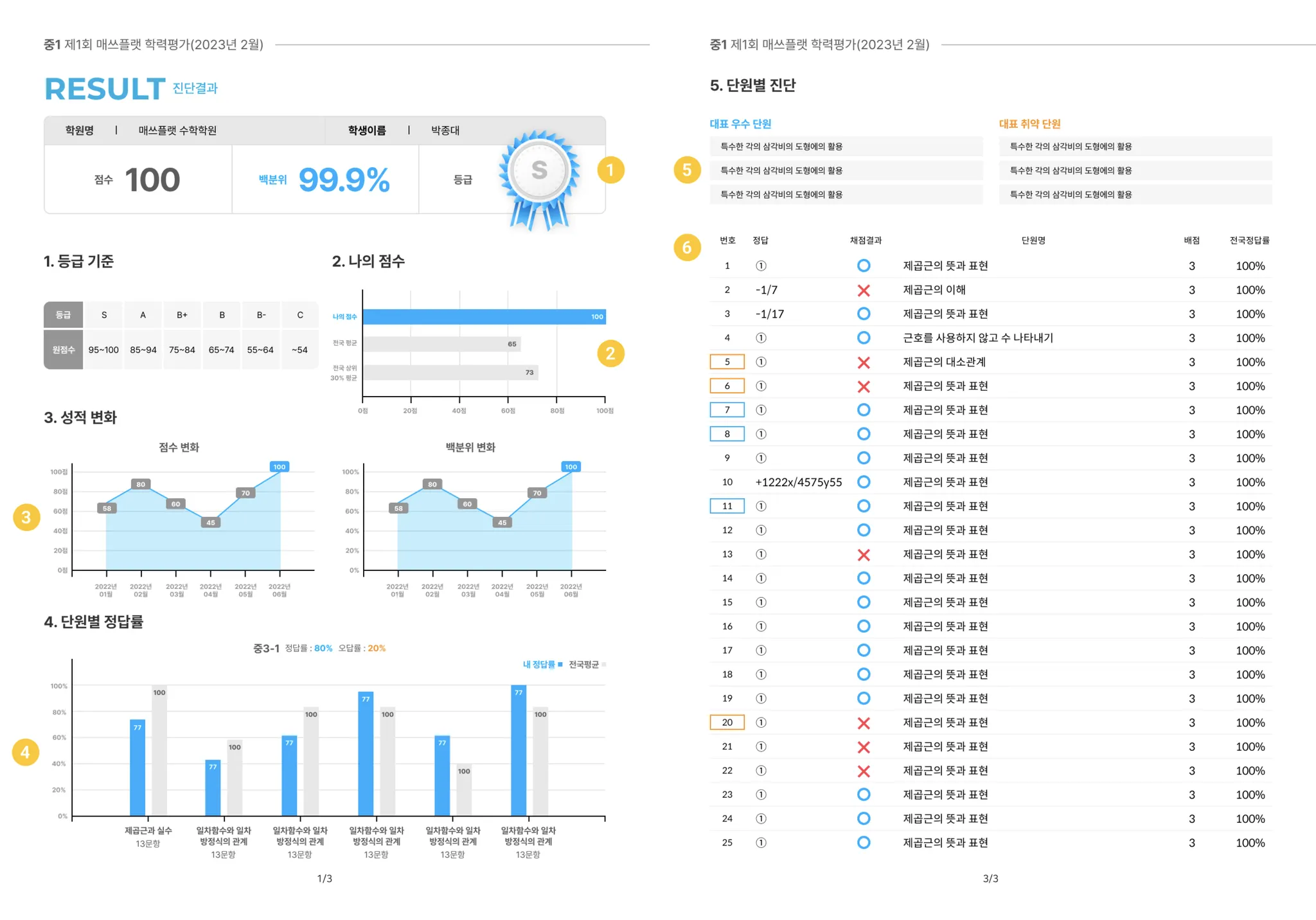 결과지: 성적 추이, 전국 대비 성취도, 단원별 진단이 포함된 결과지