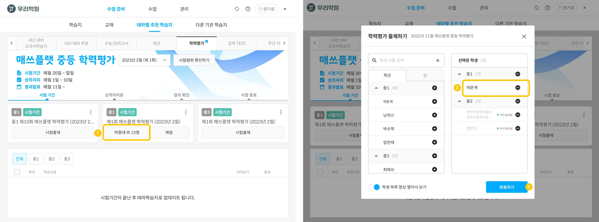 출제된 평가지의 출제된 학생,학생수 버튼을 누르면 학력평가 출제하기팝업이 뜹니다.