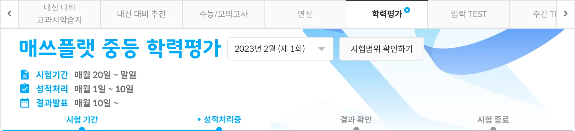 시험범위 확인하기 버튼 선택 시, 해당 학력평가 회차의 시험 범위를 확인할 수 있습니다.