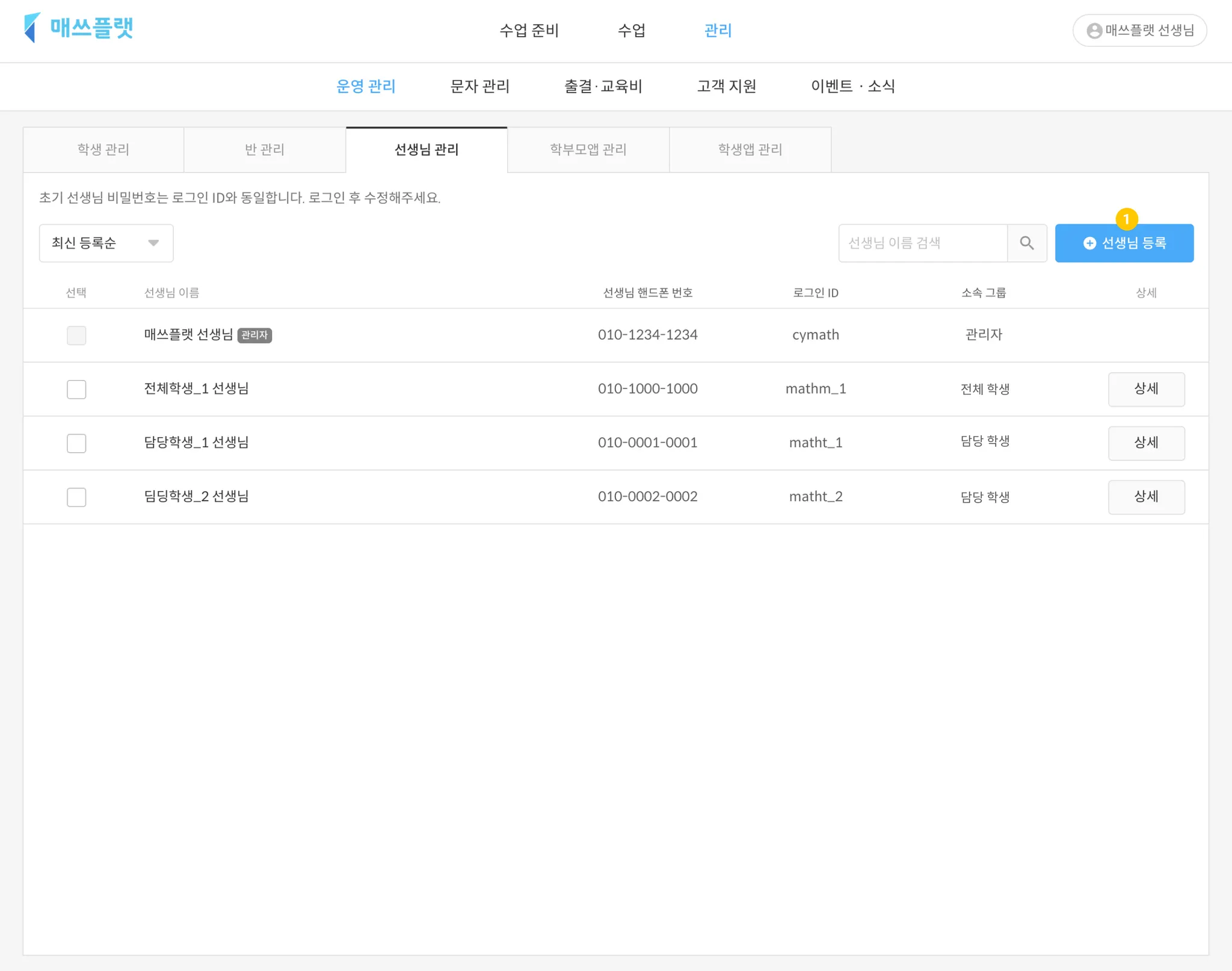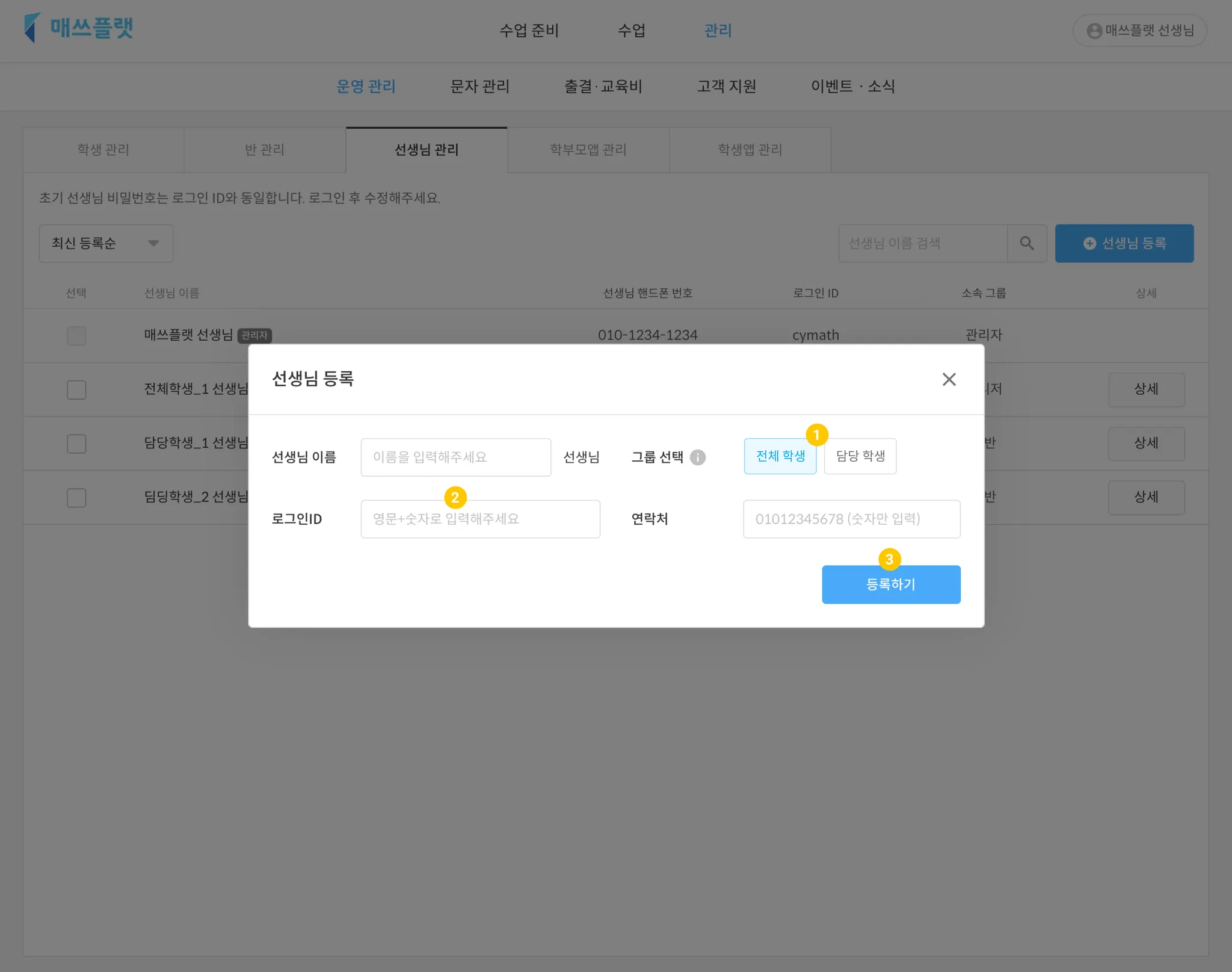 * 선생님 등록 시 초기 패스워드는 ID와 동일합니다.