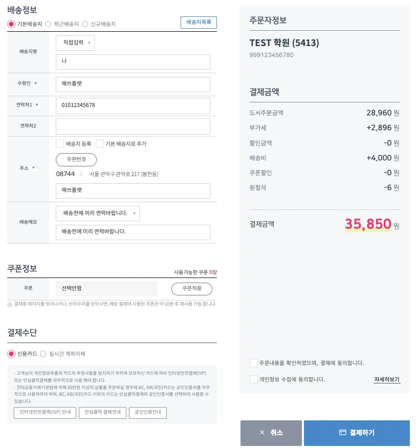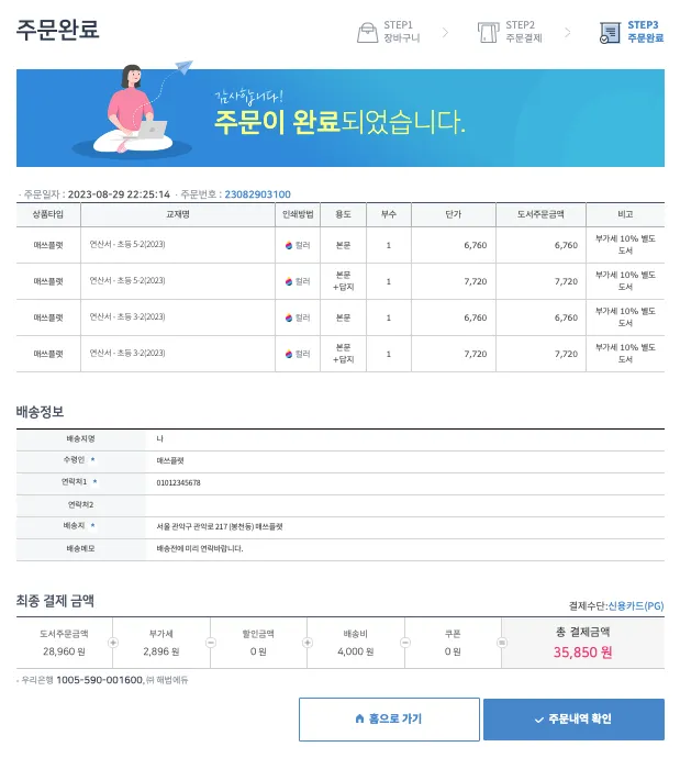 재주문 (이미 주문한 교재의 수량 추가)는 페이지샵-마이페이지 메뉴를 이용해 주세요.