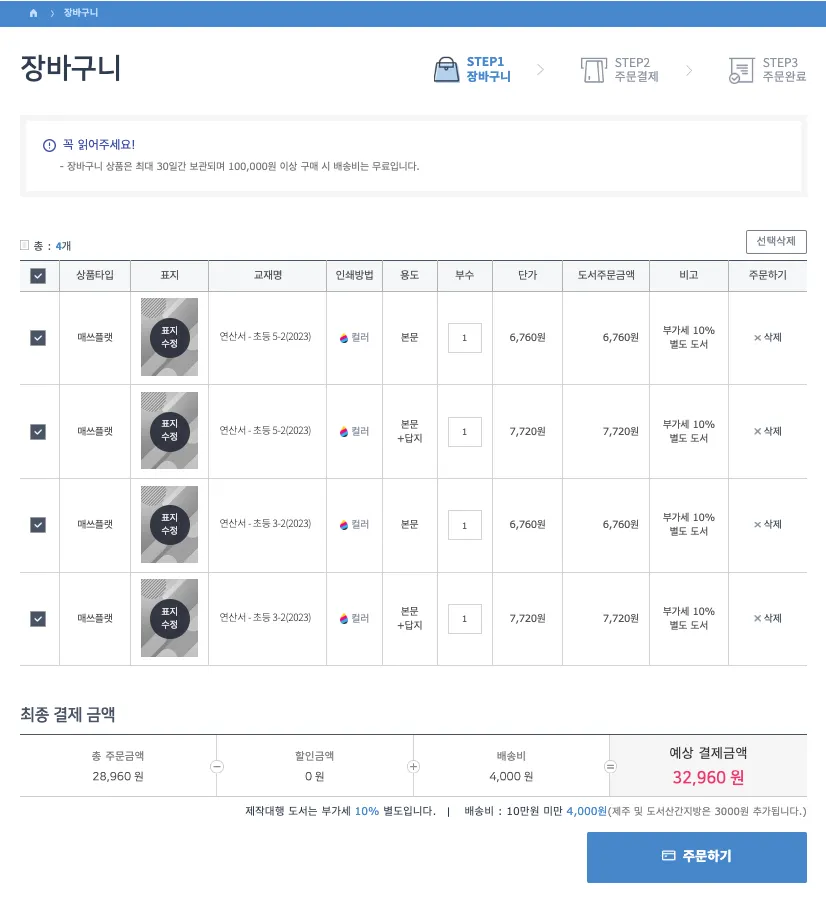 Step1교재선택 - Step2표지편집 - Step3주문결제 - Step4제작배송