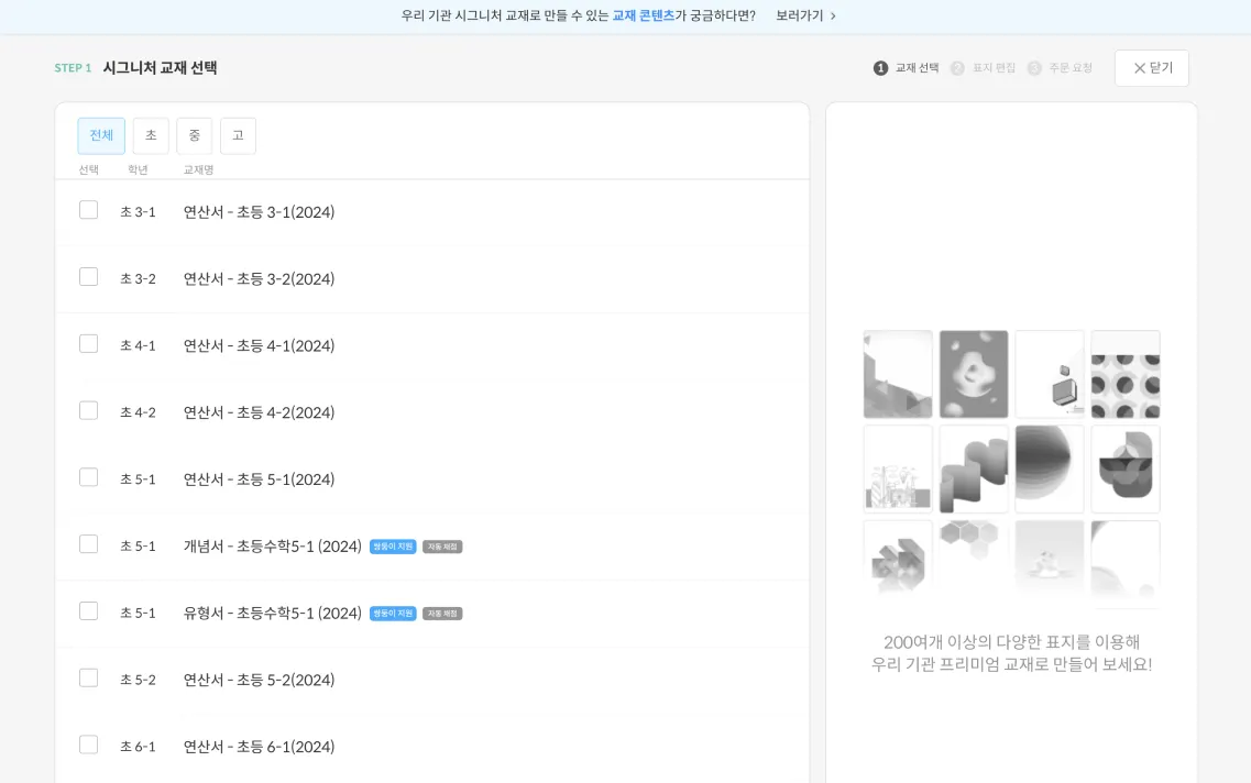 시그니처 교재 메뉴로 접근하여 제작을 원하는 교재를 선택합니다.