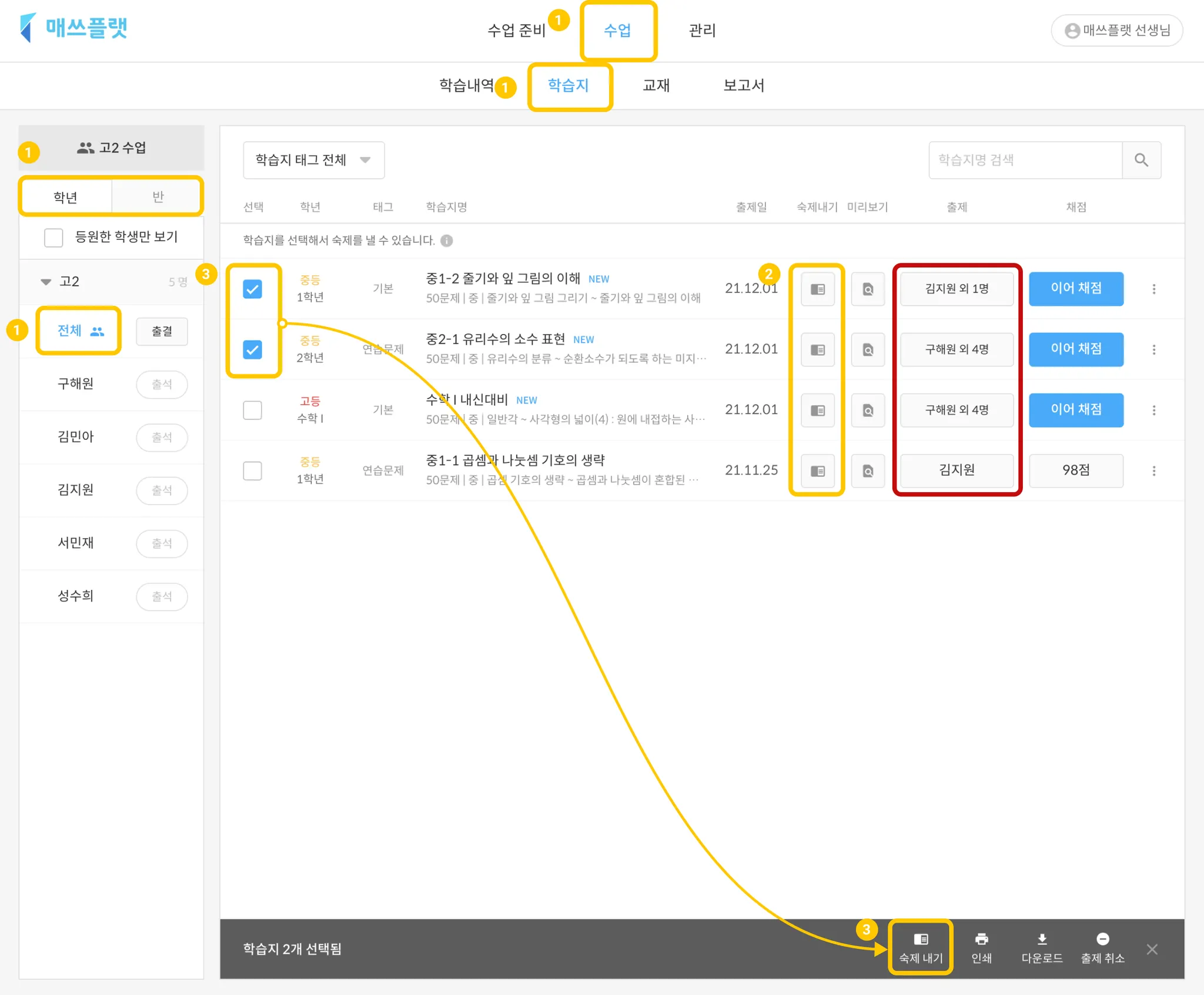 수업 > 학년, 반 또는 학생 선택 > 학습지