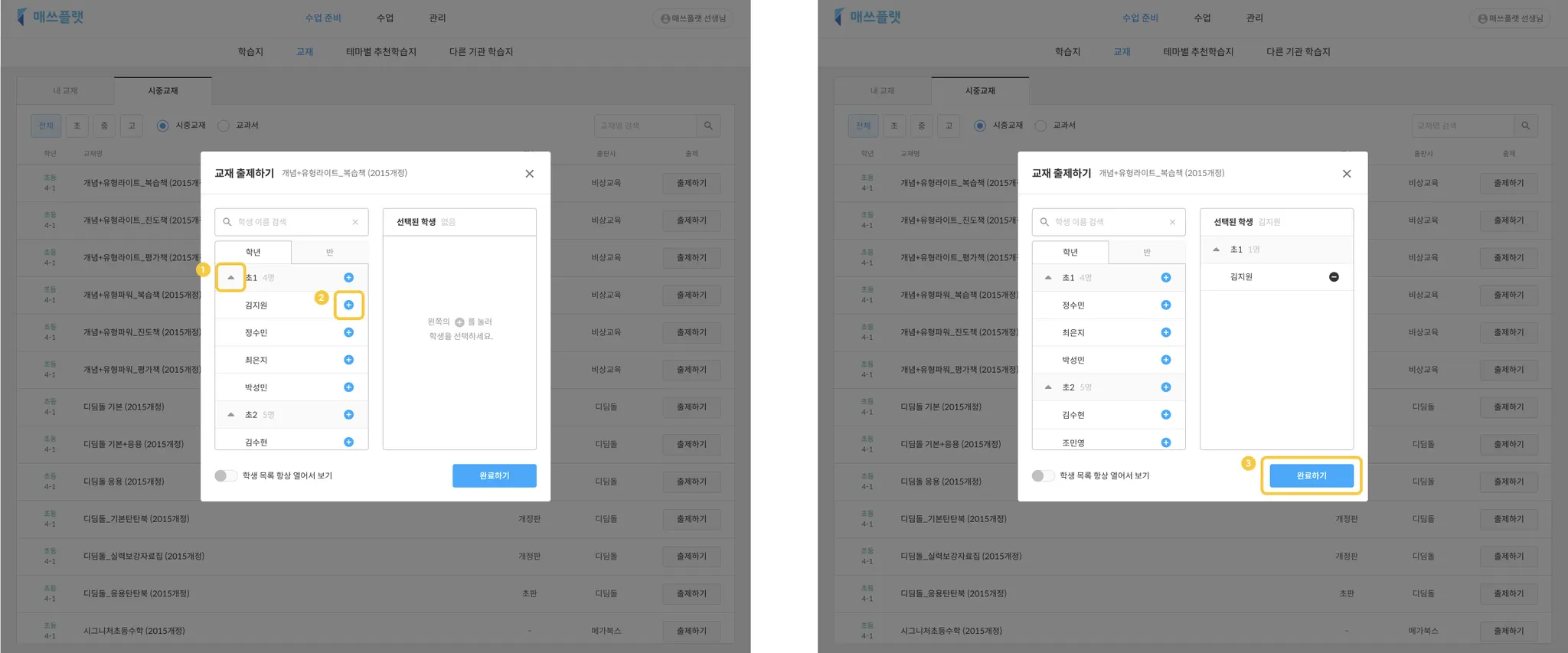 목록의 + 버튼을 누르면 학생이 오른쪽 열에 추가됩니다.