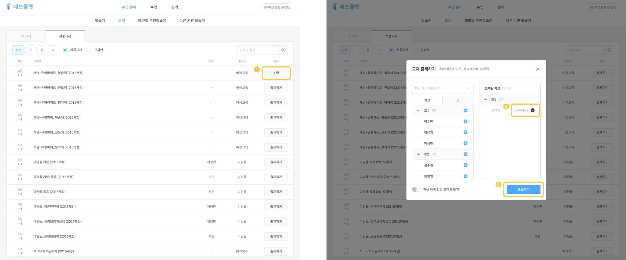 출제하기 버튼을 눌러 학생에게 시중교재를 출제할 수 있습니다.