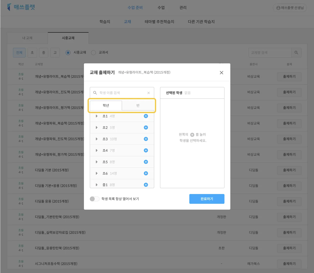 학년탭을 선택하면 학년별로 원하는 학생에게 출제가 가능합니다.